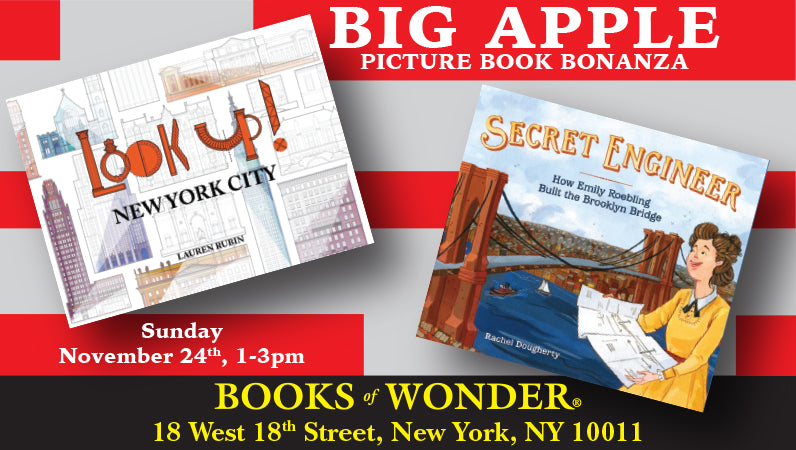 Join us at our 18 West 18th Street Store to learn the thrilling details about the Big Apple from authors RACHEL DOUGHERTY for Secret Engineer: How Emily Roebling Built the Brooklyn Bridge and LAUREN RUBIN for Look Up! New York City. Come hear these amazing authors discuss their work, answer questions from the audience, and sign copies of all their books. Sunday, November 24th 1-3pm Ages 4 & up.