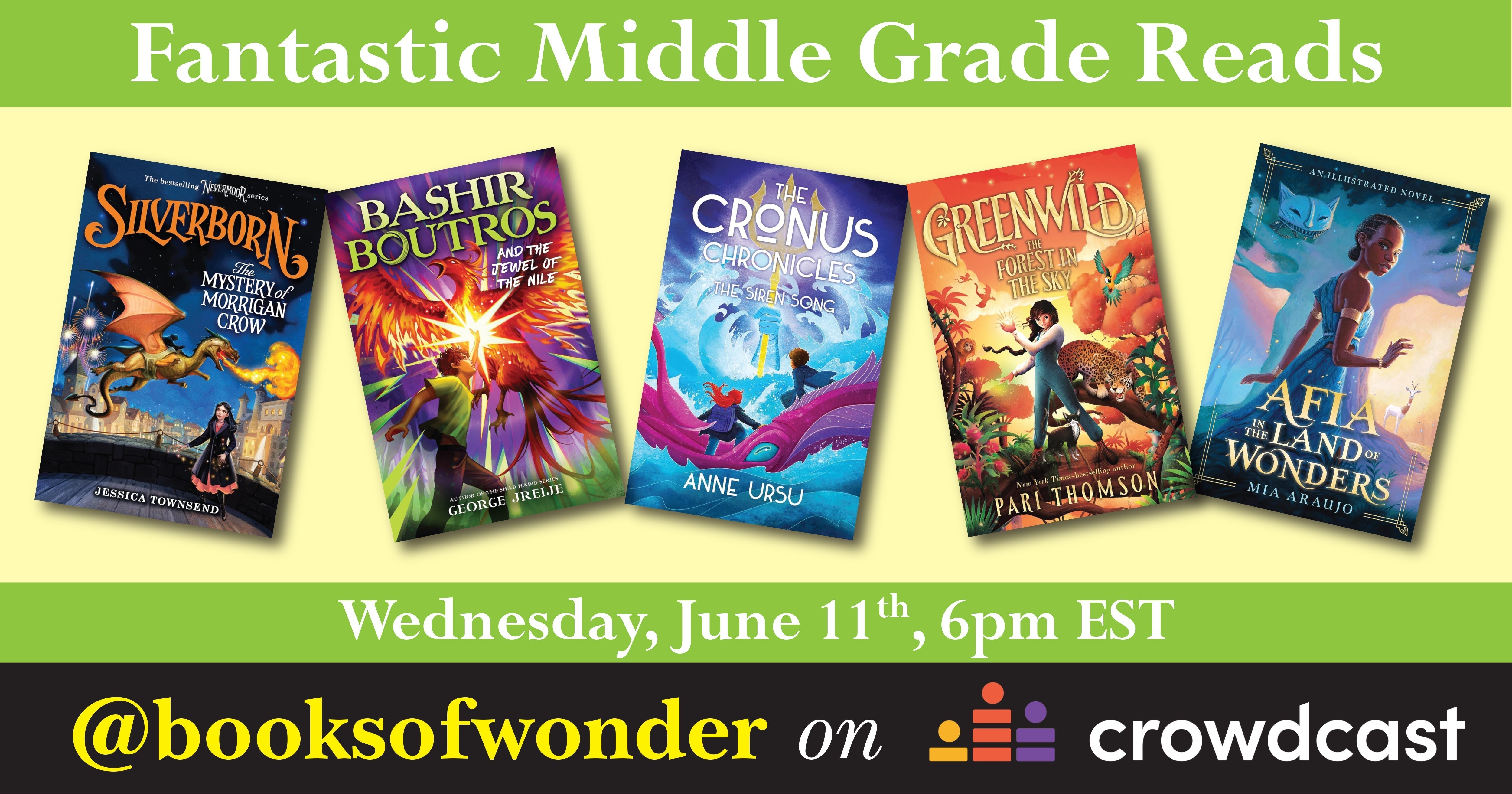 Tune in to celebrate these wonderful middle grade titles and travel to distant, magical realms. We are so pleased to be hosting MIA ARAUJO, author of Afia in the Land of Wonders, GEORGE JREIJE, author of Bashir Boutros and the Jewel of the Nile, JESSICA TOWNSEND author of Silverborn: The Mystery of Morrigan Crow, PARI THOMSON, author of Greenwild: The Forest in the Sky, and ANNE URSU author of The Siren Song, Silver-tongued shapeshifters, enchanted rings, and hidden places — all this and more awaits!