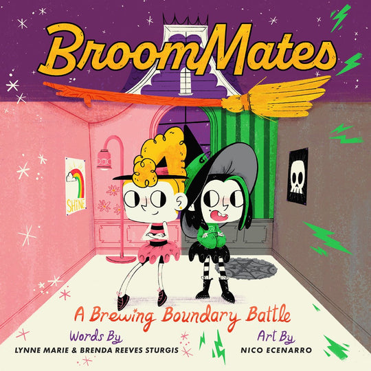 Broommates: A Brewing Boundary Battle by LYNNE MARIE and illustrated by NICO ECENARRO. There's room for improvement when witchy sisters Mathilda and Malin share a broom, and a room! One's bright and airy, the other dark and scary! Each sister knows exactly how they should decorate. Unfortunately, their disagreement ends in disaster and a broken broom. Will they ever find a way to meet in the middle?