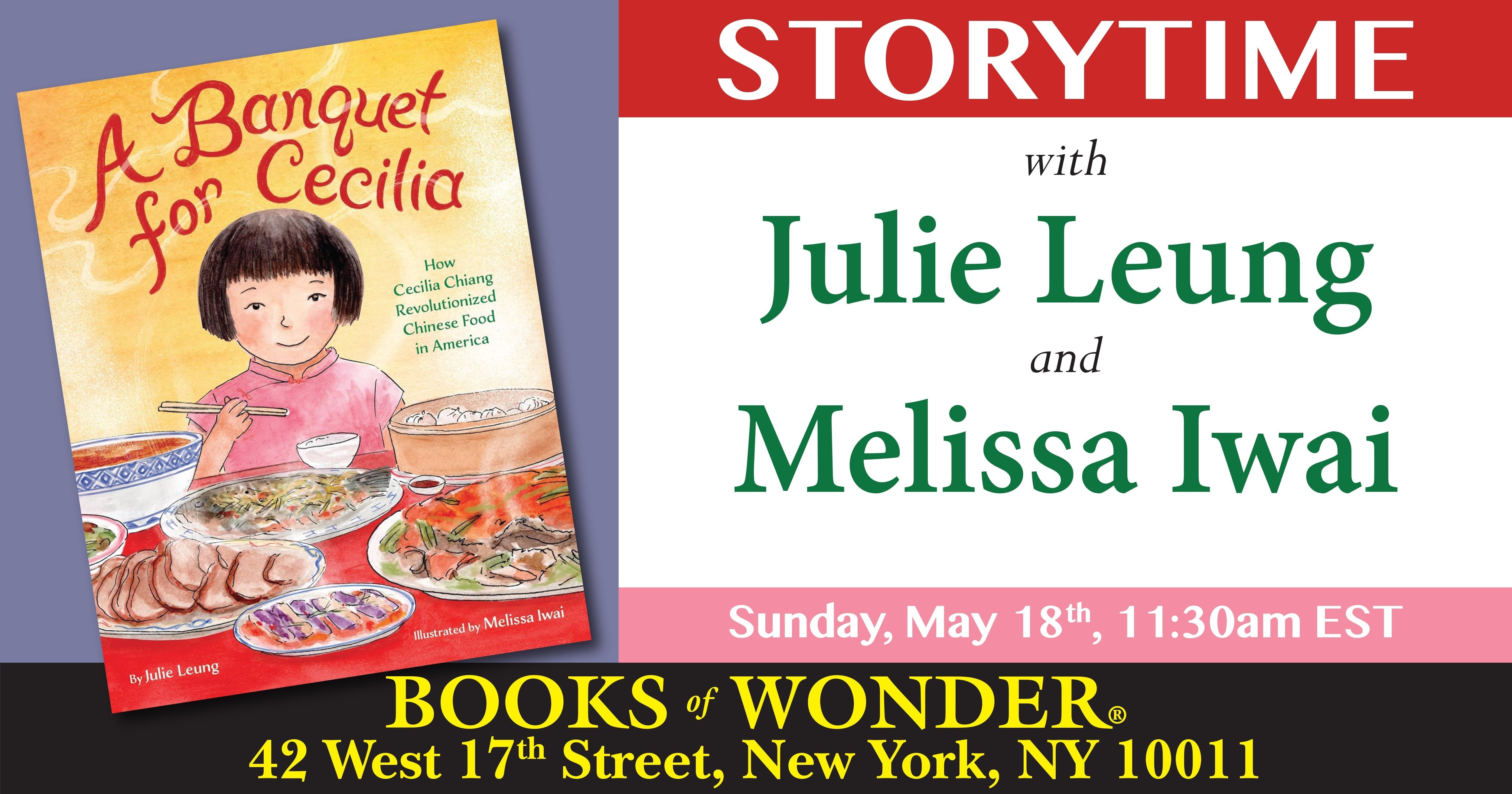 Join us for an enlightening and delectable storytime with JULIE LEUNG and MELISSA IWAI for A Banquet for Cecilia! Relish in the savory, tangy, and sometimes spicy dishes of Cecilia Chiang, a revolutionary who changed the way Americans viewed Chinese food.