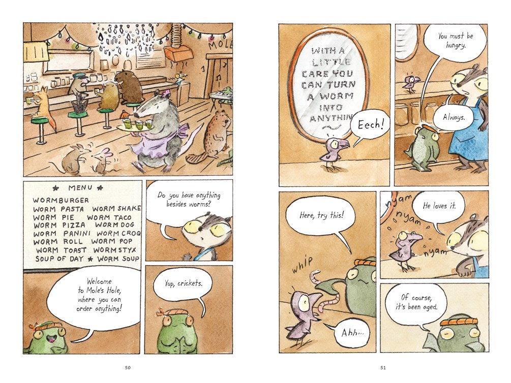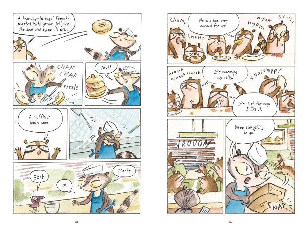 Then, one evening, when Night Chef cracks an egg open for her dinner, a baby crow named Ichi falls out! Despite being reluctant to leave her home, Night Chef steps into the wilds in order to reunite Ichi with his family. And along the journey, she might just find a family to call her own, too.