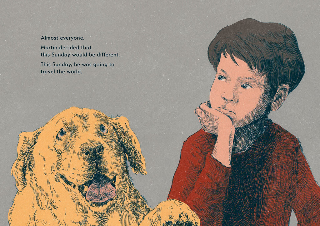 Instead, Martin invents a world adventure with his dog, Maize, braving extreme cold alongside penguins on ice caps, facing a dragon, confronting pirate ships, and crossing an arid desert on a camel’s back. When he returns from his travels happy and exhausted, he recounts his magical journey with Grandma, who marvels at his courage and wonders where he will go next.