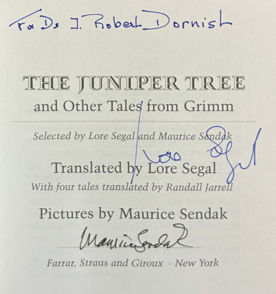 [SENDAK, Maurice]. The Juniper Tree. And Other Tales from Grimm. Selected by Lore Segal and Maurice Sendak. Translated by Lore Segal. With four tales translated by Randall Jarrell. Pictures by Maurice Sendak. NY: Farrar, Straus and Giroux [2003]. 12mo, [xii] 337pp. Black cloth decoratively stamped in silver. Black endpapers; 27 b&w plates. Spine ends a tad rubbed, else a fine copy in original color pictorial dust jacket. Inscribed by the translator, Lore Segal, and the artist, Caldecott Medalist Maurice Sendak!