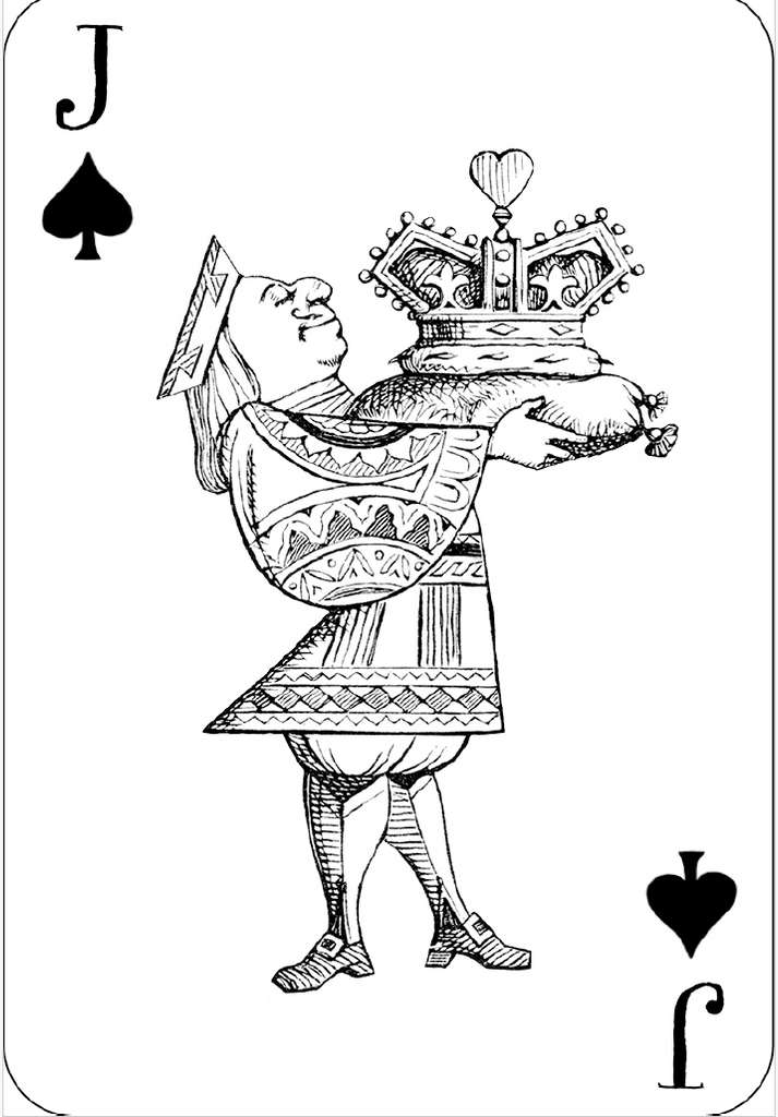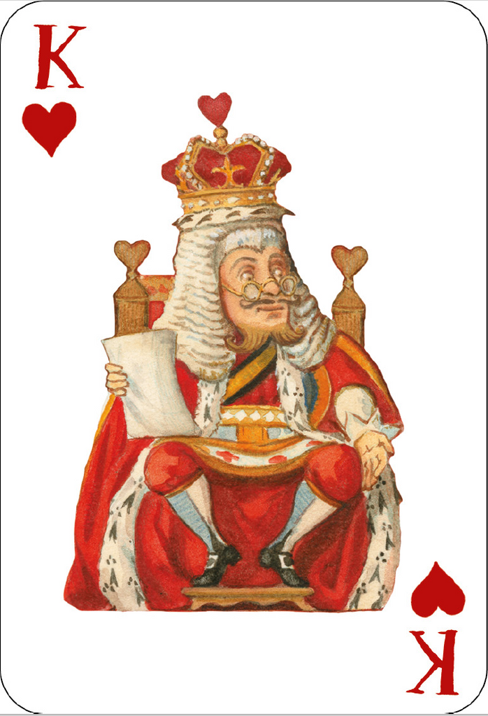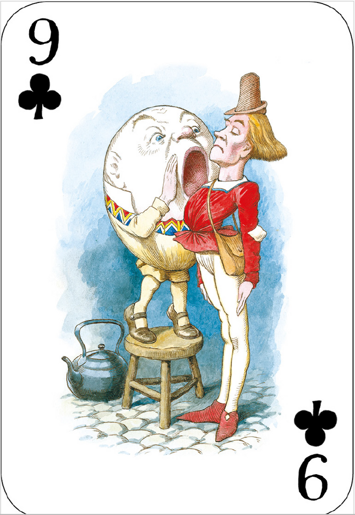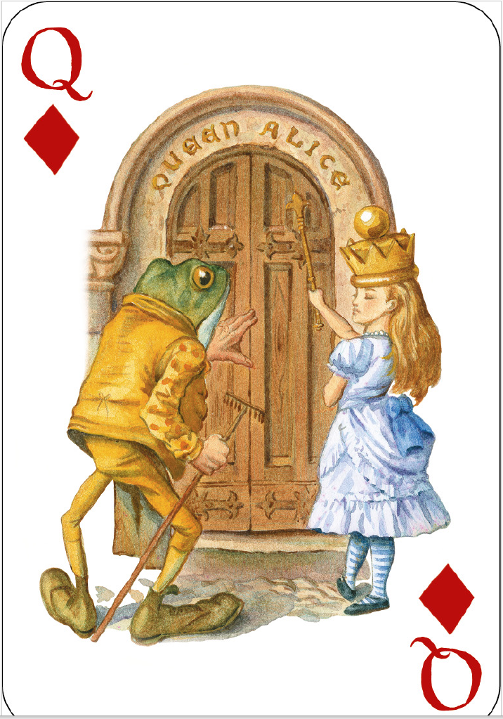 Deck of fifty-two large format playing cards, containing images from Alice's Adventures in Wonderland and Through the Looking-Glass