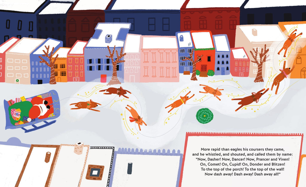 All are cozy on this Christmas Eve night. This modern retelling starts with a family dressing the Christmas tree and setting out cookies and milk for a special visitor, while a delightful winter cityscape dazzles outside. Though the city never quite sleeps, the family inside—including the cat—are all snuggled up tight. But when a clatter wakes up one child and they glimpse St. Nick’s sleigh and eight reindeer from the window, a magical meeting occurs.