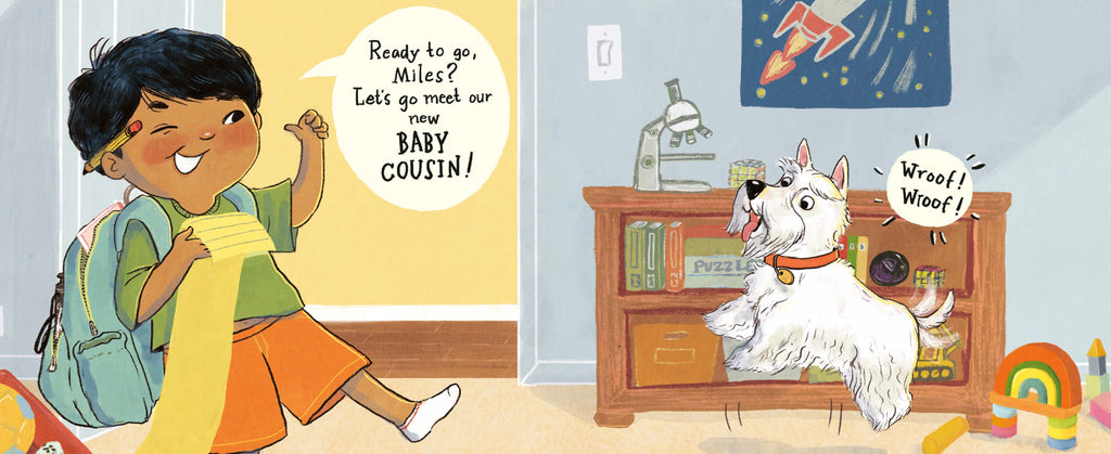 Road trip! There’s a new baby cousin in the family and this boy and his dog, Miles, can’t wait to take a trip to deliver them a shiny new present. There’s only one problem: in all the chaos of packing, the present has gone missing! In a rush to recover it, the boy encourages his family to retrace their steps around the house, but the only things they can find are an old blankie, a favorite stuffie, and his beloved booties. Luckily, Miles has excellent canine smarts and just might be able to sniff out a solution. . .