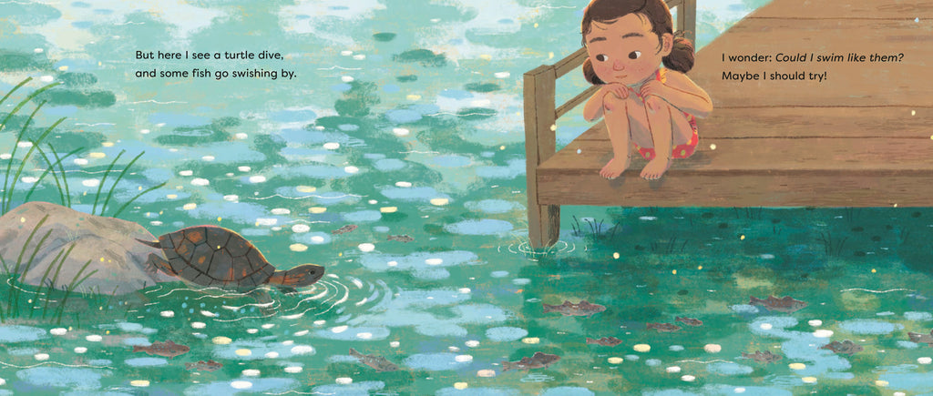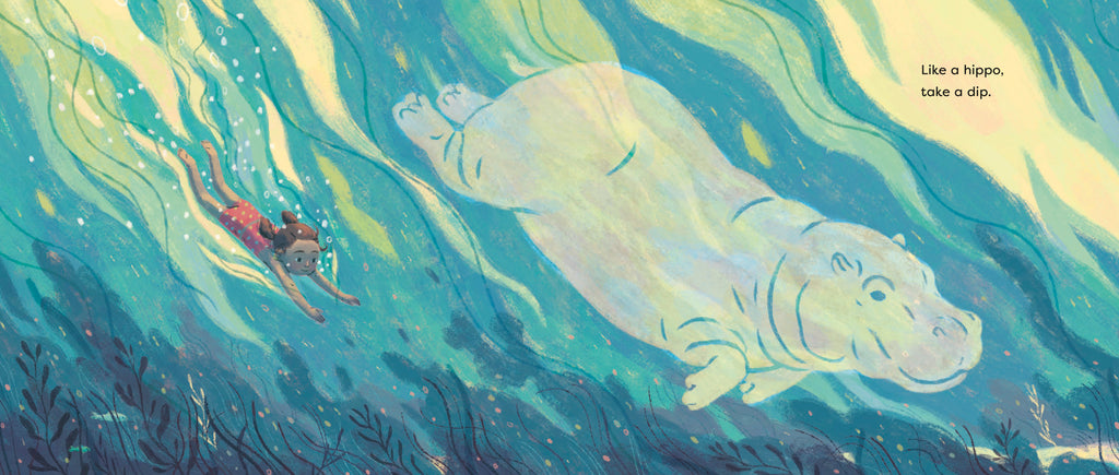Award-winning author and poet Marilyn Singer uses the beauty of nature to inspire young readers to find confidence and comfort in the water. As dolphins leap, ducks float, hippos dip, and pups paddle, children will be encouraged to embrace swimming with the same joy and courage shown by their fellow animals.