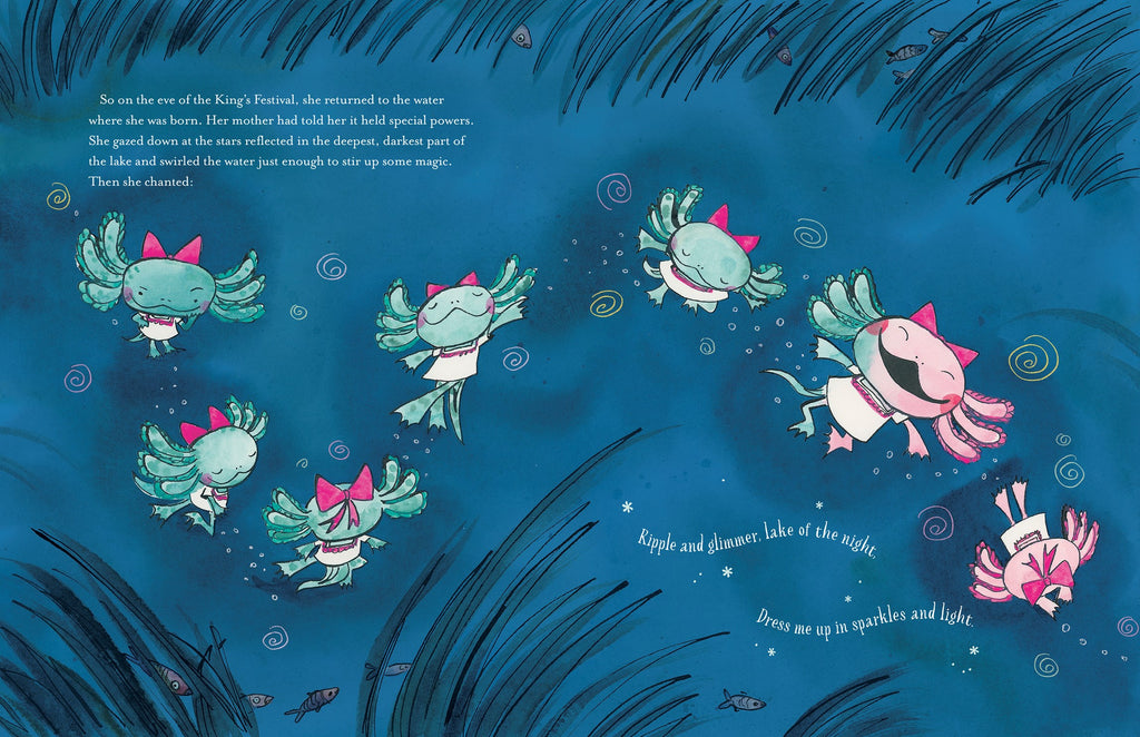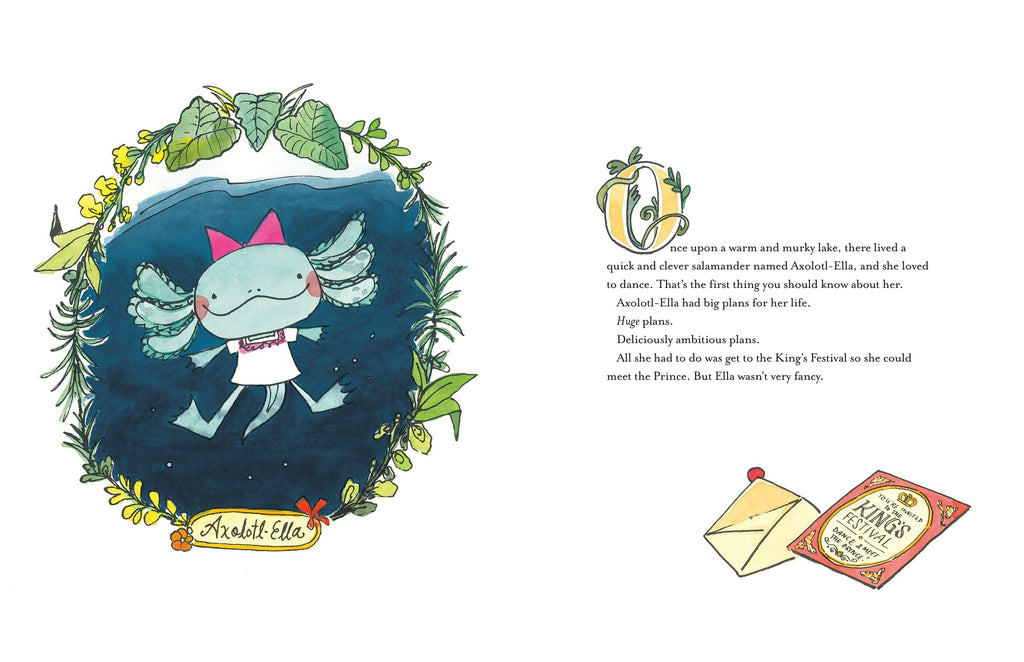 Axolotl-Ella is a quick and clever salamander with a daring, deliciously ambitious dream. All she needs to do to make her dream a reality is to meet the Prince at the King’s Festival. So with a little bit of magic from the lake of the night, Ella makes her skin gleam and her gills glow--and conjures the perfect outfit for a fancy party!