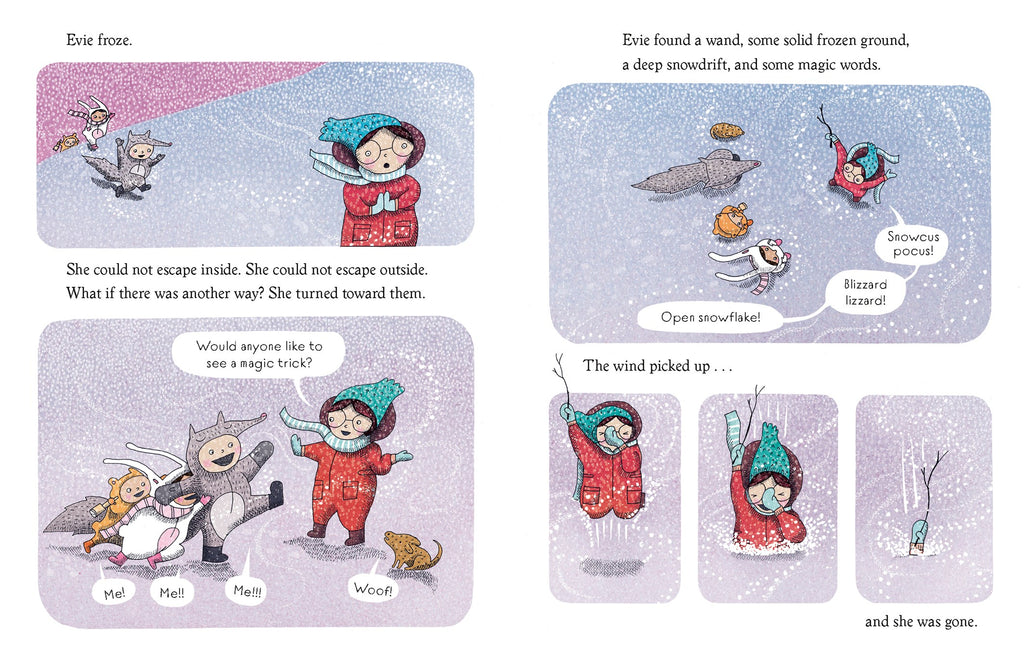 Evie believes in all things magic, but her always-pestering, always-following younger siblings make her life seem a little less magical sometimes. So Evie makes her escape to the snowy world outside, hoping for a bit of peace and solitude, only to discover her siblings trailing behind her, once again.