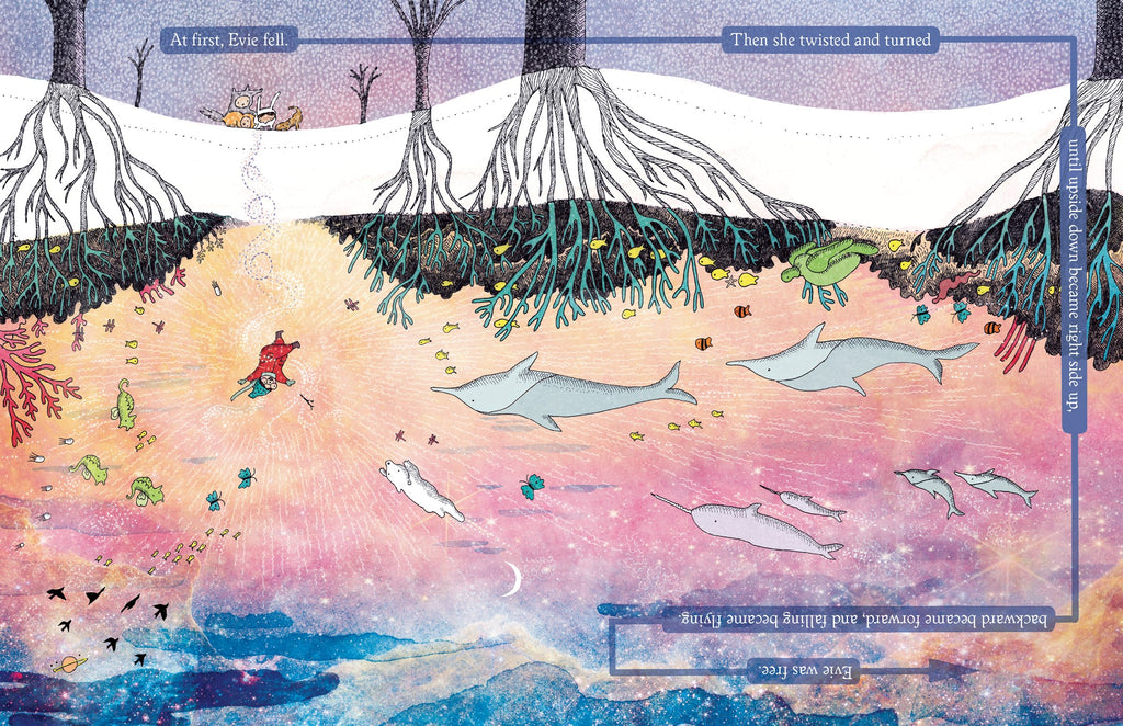 Luckily, with the help of a wand and a few magic words, Evie turns a snowbank into a portal to an upside-down world full of stars, dolphins, and seahorses to ride. Even the reader is invited to rotate the book and follow the siblings along on their adventure! But when the siblings are faced with danger—and someone who needs their help—can they come together to save the day?