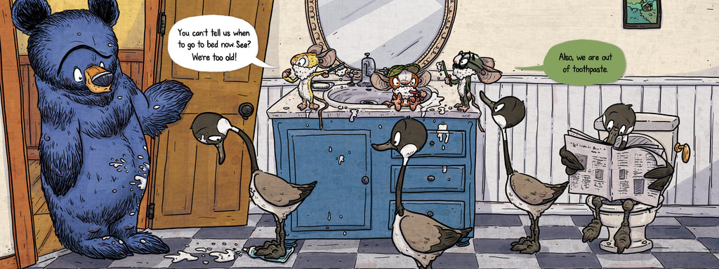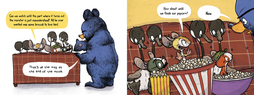 But Bruce’s family of mice and geese would rather watch late-night monster movies than go to sleep.