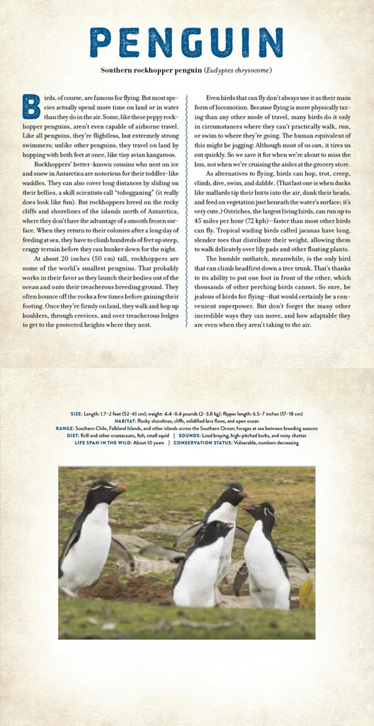 The opening essay focuses on bird behaviors—the weird, and the surprising. The profile accompanying each animal image includes information on each species. It's an aviary that you can hold in your hands!