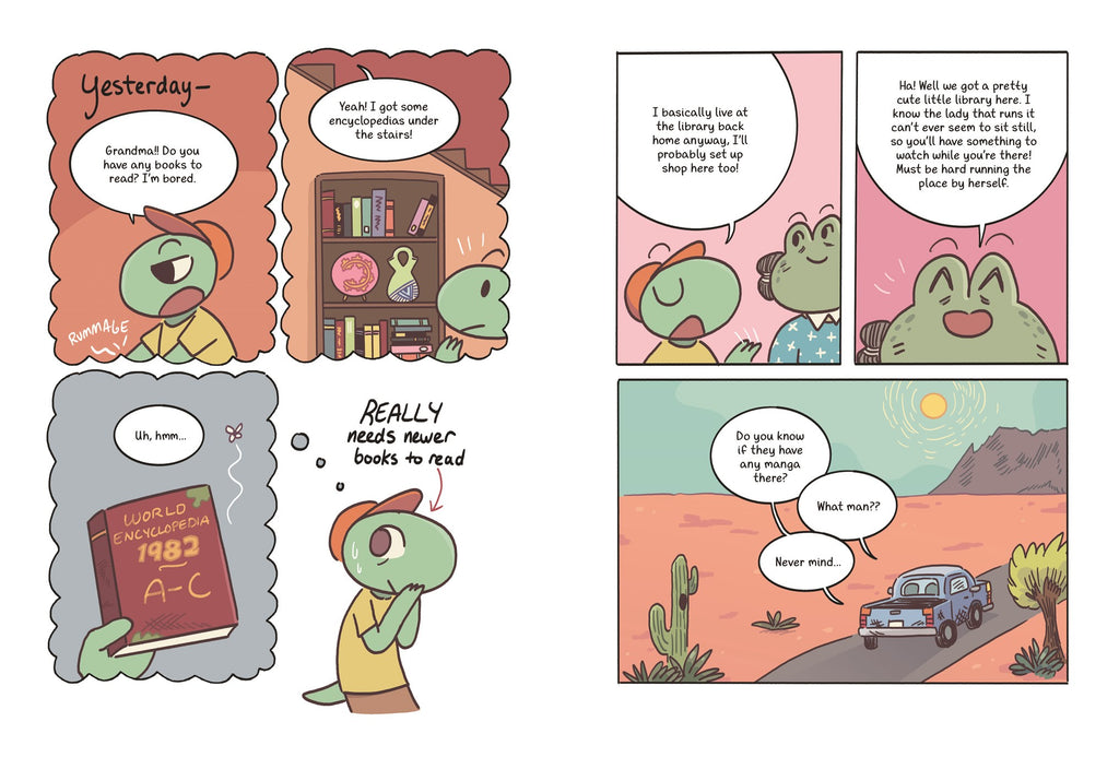 Anura is a young frog spending the summer back home with their grandmother. With some...er...gentle prodding from Grandma, they get a job working at the local library. It's about 11 minutes in when they're tasked with a big project: create an archive that captures what makes Soggy Stump so special.
