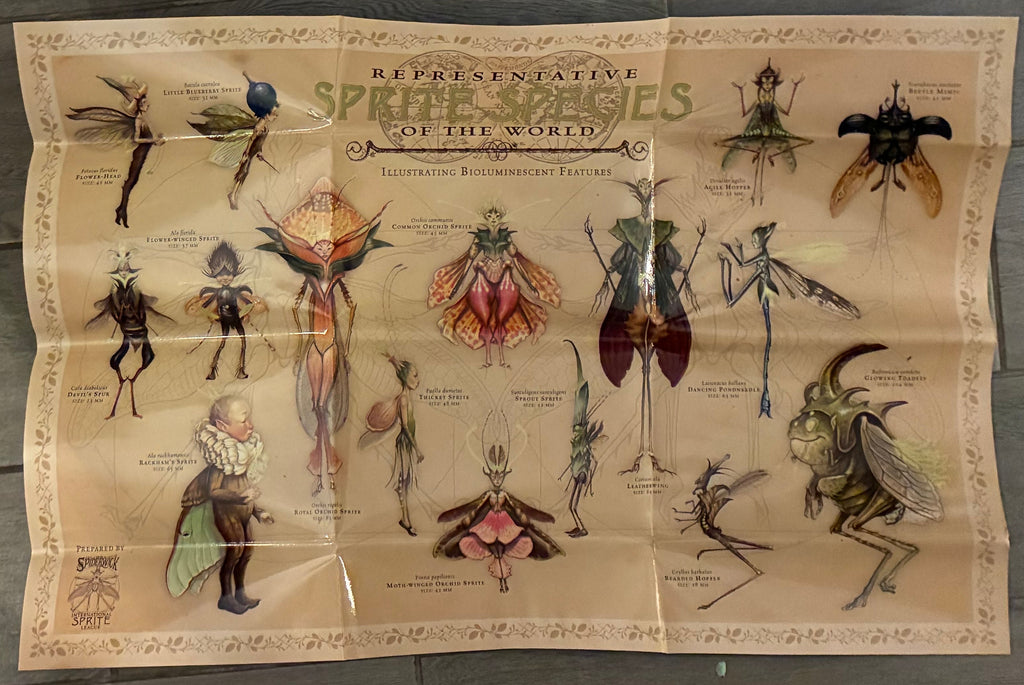 First edition. A charming reference guide to the best-selling series that has spawned a Disney+ television show. Forget everything you know -- or think you know -- about sprites, and listen to the experts from the International Sprite League as they, with the assistance of the creative team that brought you the bestselling Spiderwick Chronicles, provide a resource that will prove to be as essential for any novice sprite keeper (or collector!) as a strong cage and eyes in the back of his or her head. The wonderful reversible dust jacket on this first edition fold out into a 30 1/2" x 20 1/2" glow in the dark poster showing the representative Sprite species of the world!