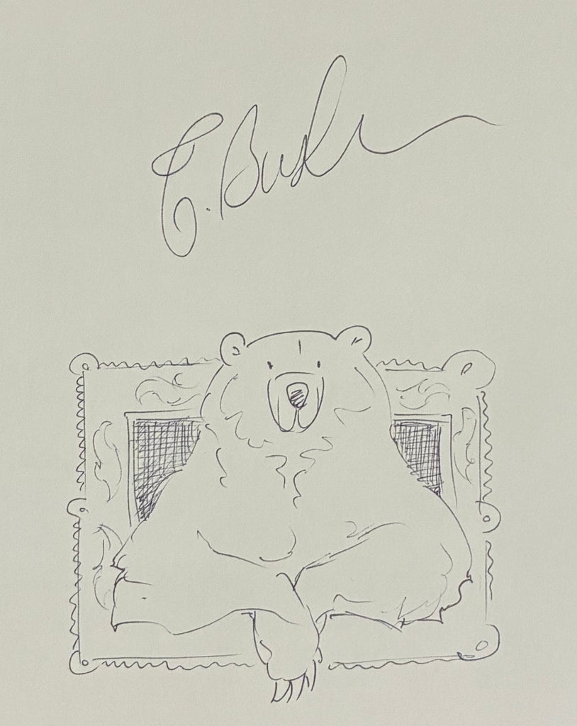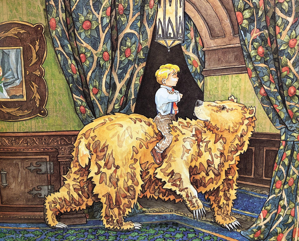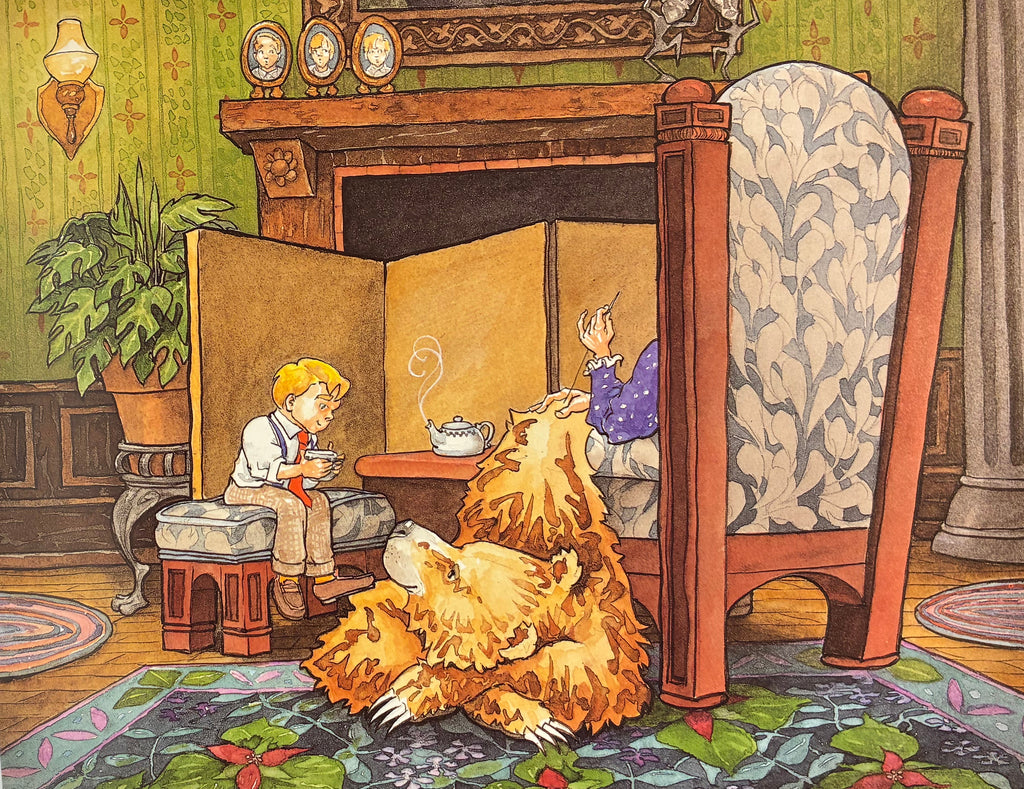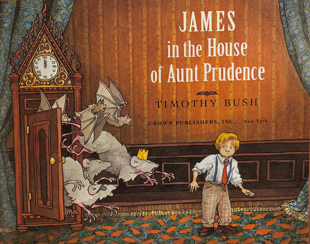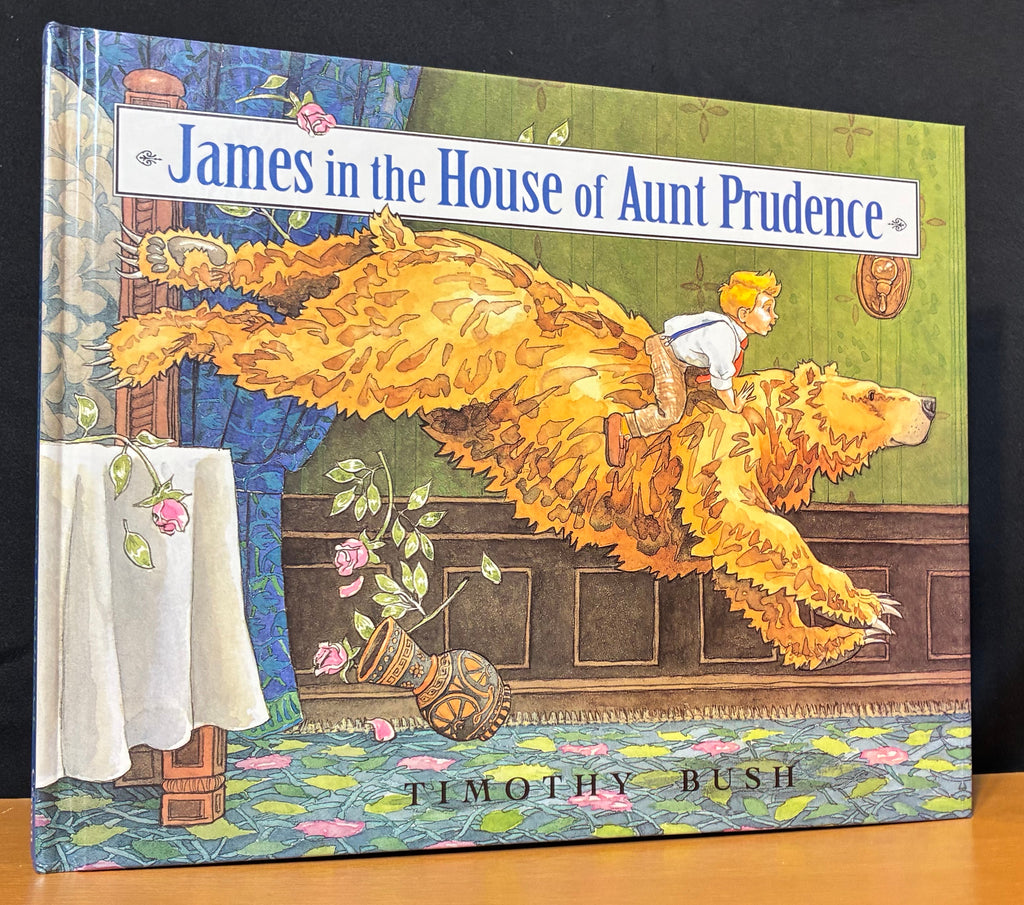 BUSH, Timothy. James in the House of Aunt Prudence. NY: Crown [1993]. Oblong 8vo, [32]pp. Color pictorial boards. Blue endpapers; color illustrations on every page. A fine copy in original color pictorial dust jacket. Signed by the author/artist, Timothy Bush, with a drawing!