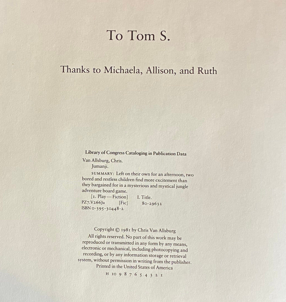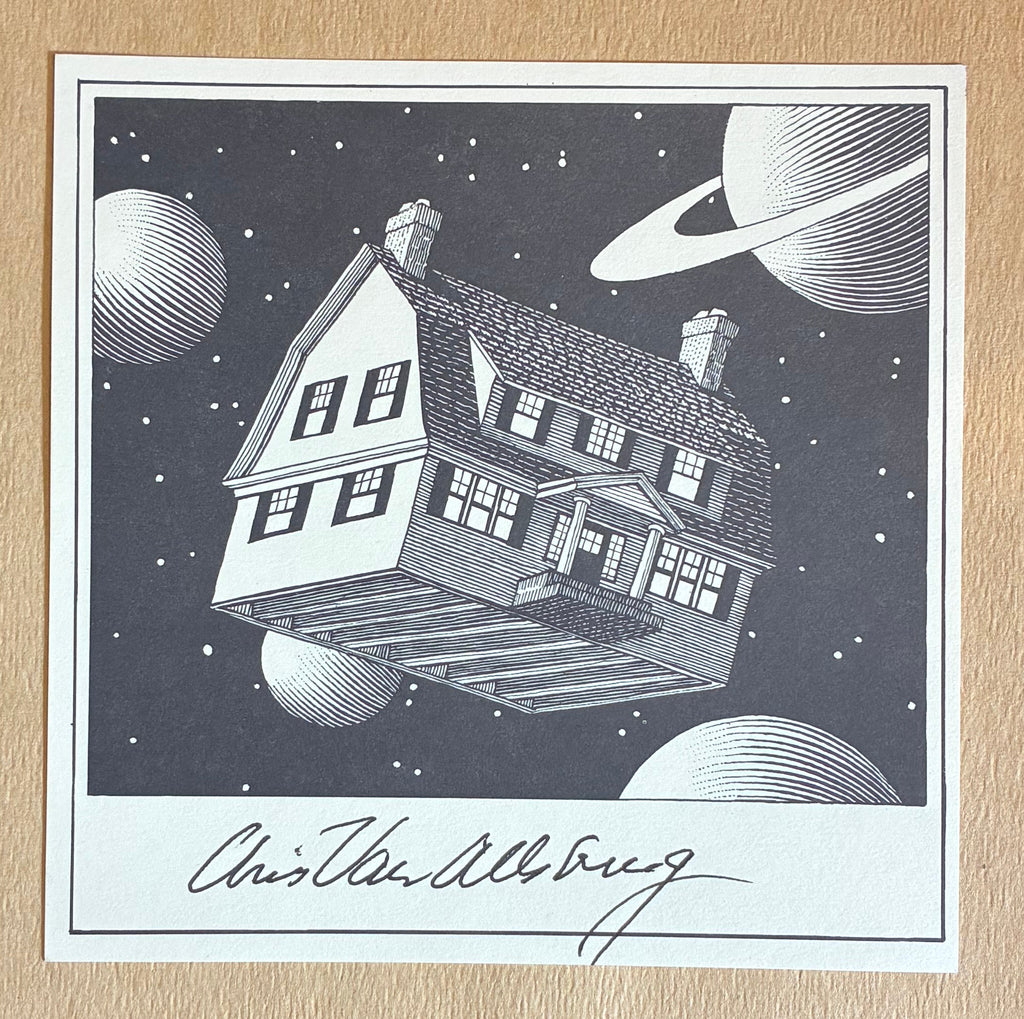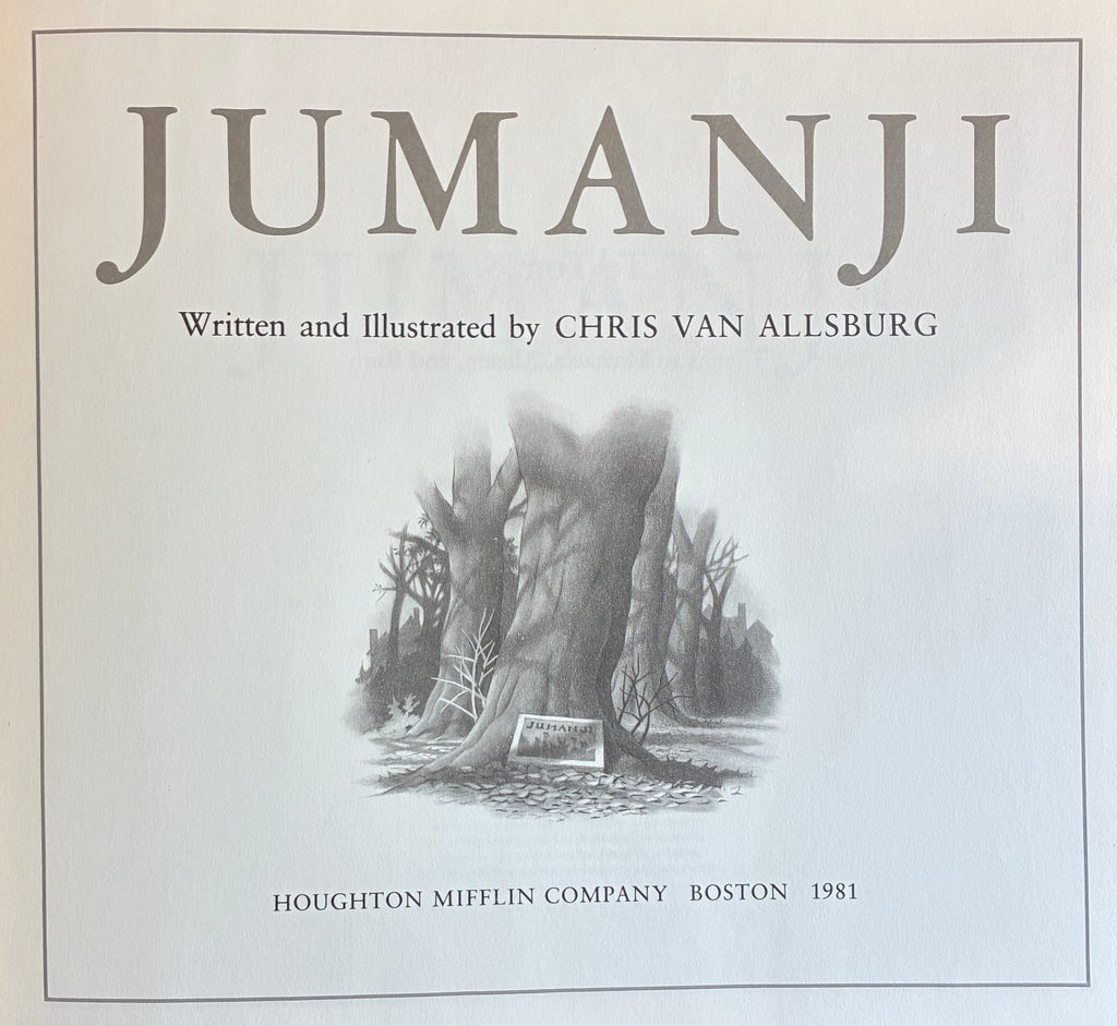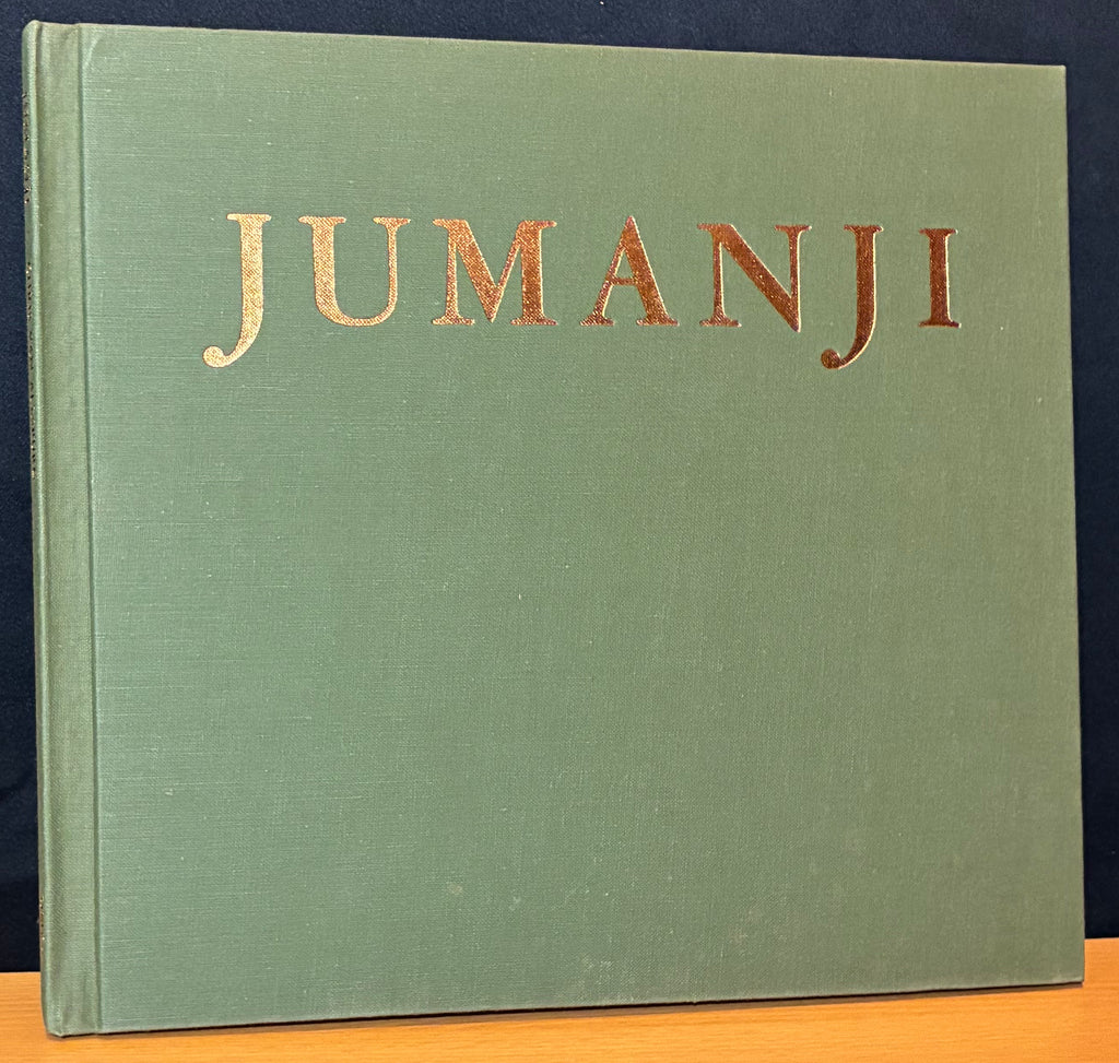 Van ALLSBURG, Chris. Jumanji. Boston: Houghton Mifflin, 1981. Oblong 4to, [32]pp. Olive cloth stamped in bronze. Straw-colored endpapers; b&w illustrations on every other page. Spine ends a tad rubbed, else a clean, tight copy in original pictorial dust jacket (spine ends a tad rubbed, no medal affixed). With a bookplate signed by the author/artist, Chris Van Allsburg, laid in!