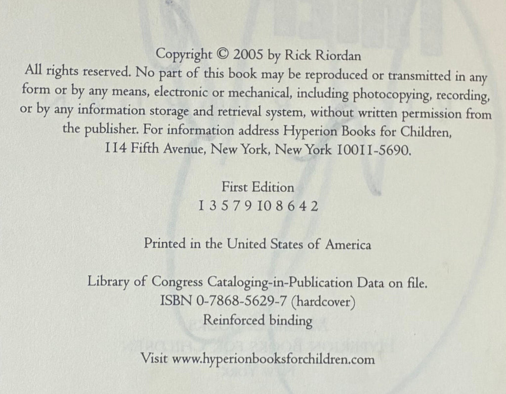 First edition. The first title in the Percy Jackson and the Olympians series, featuring a dust jacket design that was soon replaced when Caldecott Honor Artist John Rocco was brought on board. When Percy discovers his long absent father is actually a Greek god – making him a teenage demi-god! – his world is turned upside down. As if monsters trying to kill him weren’t bad enough, now he’s been accused of stealing Zeus’s thunderbolt. And if he doesn't find the real culprit and return the thunderbolt, the gods may go to war! The start to one of the most popular and best-selling series of the past 20 years. Also the basis for the 2010 film and the currently running Disney+ series.