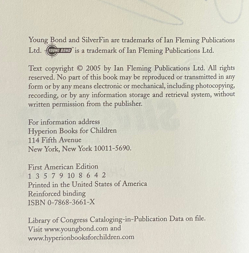 First US edition. The first book in Higson's 9 book series following the adventures of a young 007! Before the name became a legend. Before the boy became a man. James Bond will one day become the world's most famous spy, but right now his challenge is to fit in at his new school: making friends, learning the rules and standing up to bullies. However, unknown to James there is an even tougher challenge awaiting him on the remote shores of Loch Silverfin - a terrifying discovery that threatens to unleash a new breed of warfare.
