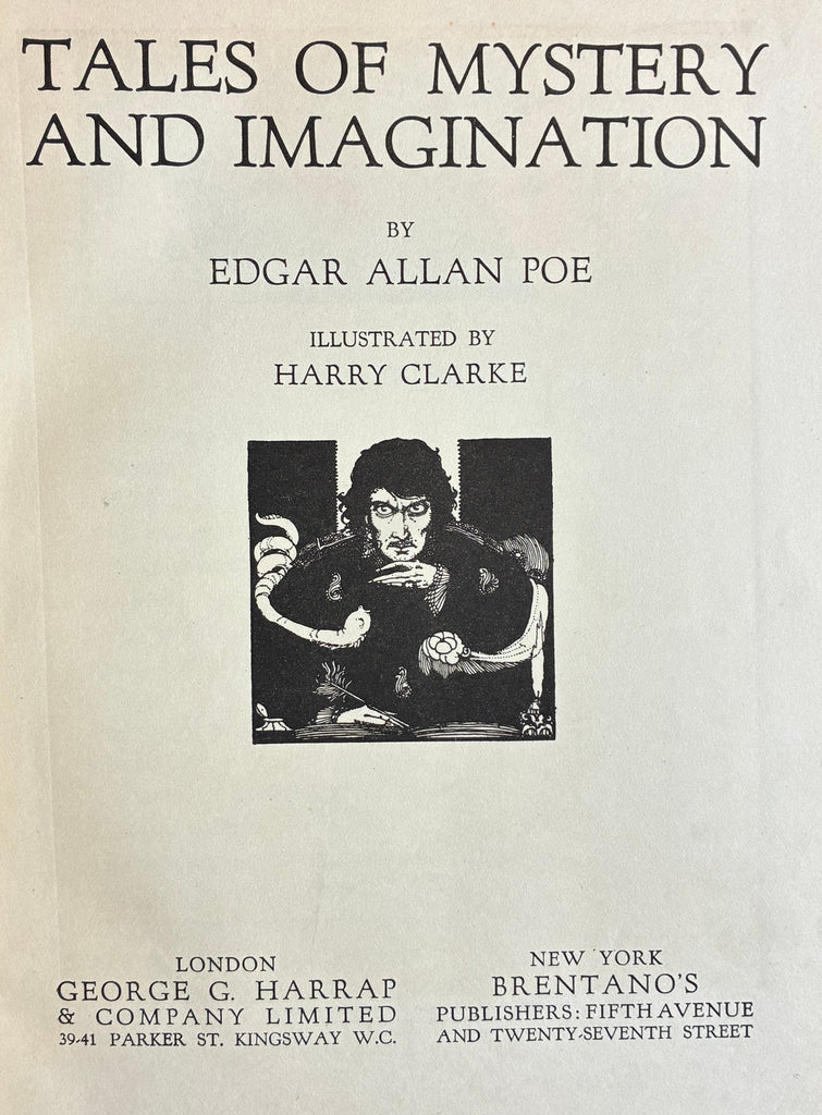 [CLARKE, Harry]. Tales of Mystery and Imagination. By Edgar Allan Poe. Illustrated by Harry Clarke. London & New York: George G. Harrap / Brentano’s [1923]. 4to, 383pp. Black cloth with spine decoratively stamped in gilt and with pictorial label affixed to front; top edge stained black. 8 color plates and 24 full-page b&w illustrations. Spine ends and corners a tad rubbed, slight rippling to cloth at top corner of rear board and top center of front board, previous owner’s bookplate affixed to front free endpaper, endpapers a tad aged, else a clean, tight copy.