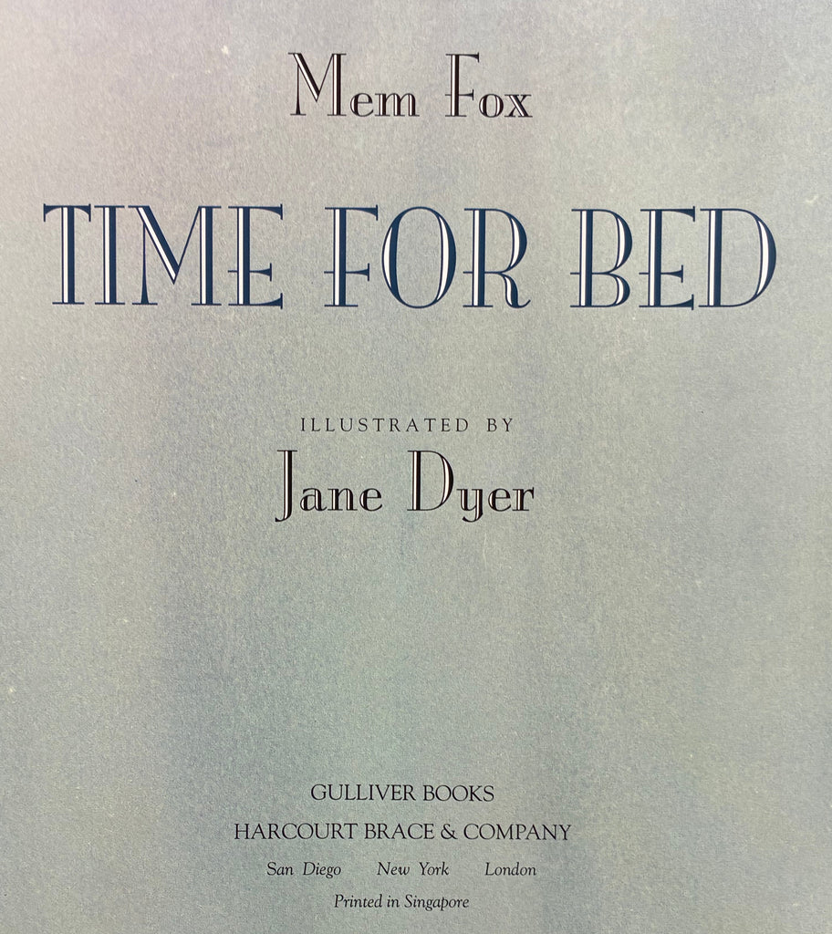 FOX, Mem. Time for Bed. Illustrated by Jane Dyer. San Diego: Gulliver Books [1993]. Square 8vo, [32]pp. Color pictorial boards. Patterned endpapers; color illustrations on every page. A fine copy in original color pictorial dust jacket. With a bookplate signed by the artist, Jane Dyer, laid in!