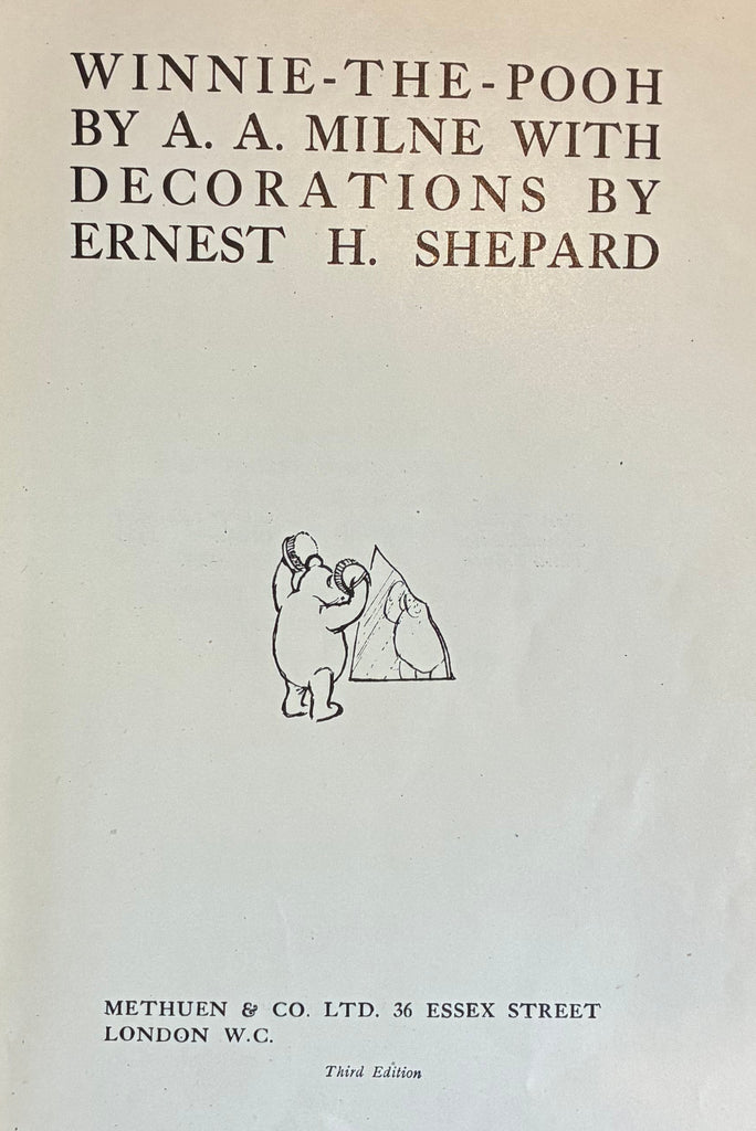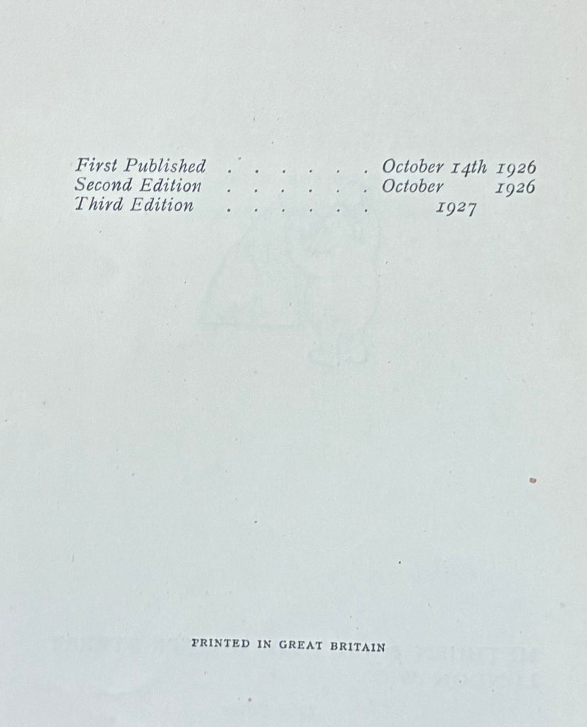 Third printing. Milne’s classic tales of Winnie-the-Pooh were a smash hit upon release, prompting a second printing to be done within the same month (October, 1926) as the publication. This third printing copy was released shortly into the next year!