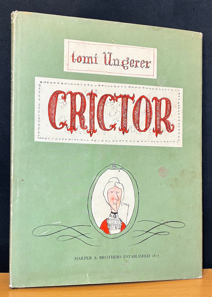 UNGERER, Tomi. Crictor. NY: Harper & Brothers [1958]. 4to, [32]pp. Black cloth spine with color pictorial boards. Color illustrations on every page. Upper and lower edges a bit rubbed, rear board a tad discolored, endpapers a tad browned near hinges, light handsoiling at margins of a few pages, else a clean, bright copy in original color pictorial dust jacket (folds and edges rubbed, some slight soiling and wear). With a bookplate signed by the author/artist, Tomi Ungerer, laid in!