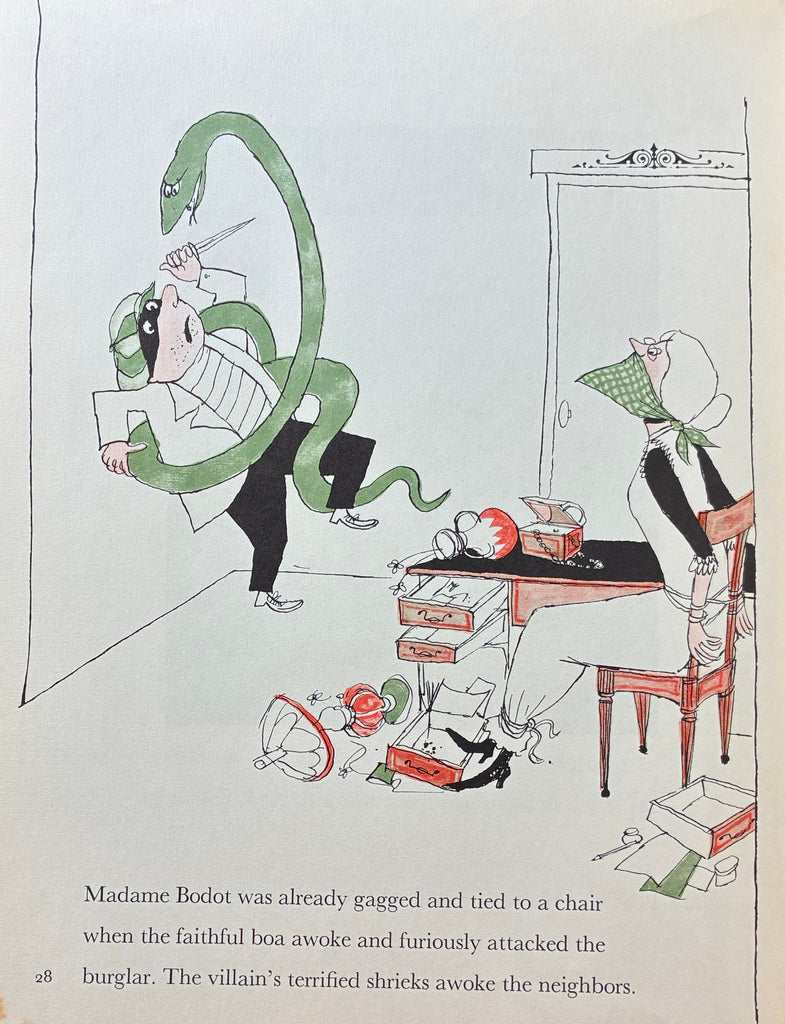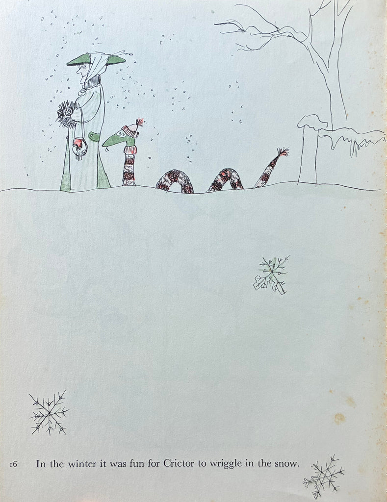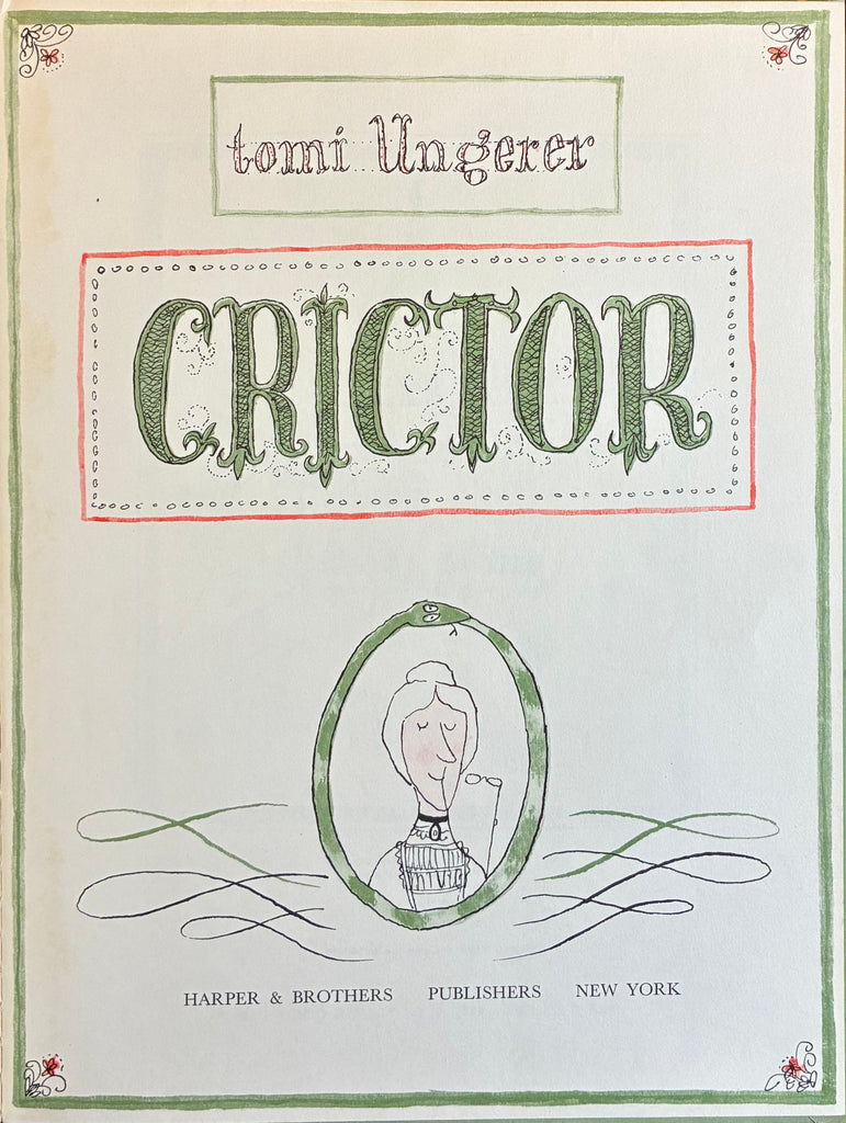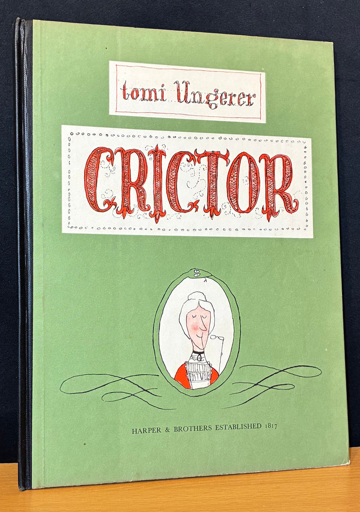 First edition of the only Tomi Ungerer title to have never been out-of-print since its first release in the US. The charming story of Crictor, the loveable and affectionate pet snake who saves the day when he thwarts a robbery! Crictor is this beloved author’s third book, published just one year after his debut picture book The Mellops Go Flying.