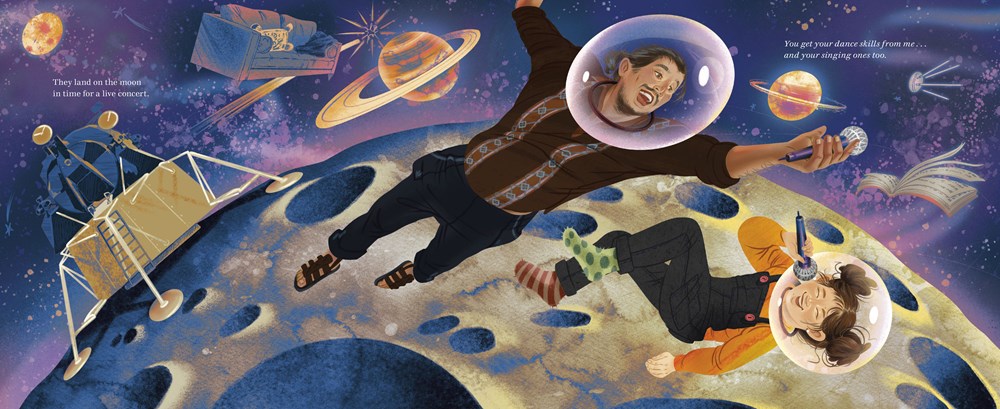 Giselle and Papi are happy together, but there was a time when their two was three, and sometimes remembering is painful. It can also be a lot of fun! They embark on an imagination adventure that includes rainforest hikes, intergalactic planet-hopping, and most of all, remembering Mami through her favorite activity—creating stories and new memories.