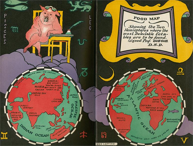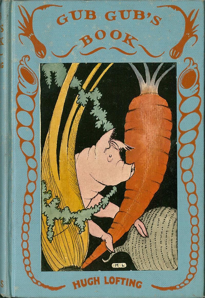 LOFTING, Hugh. Gub Gub's Book: An Encyclopedia of Food in Twenty Volumes. NY: Frederick A. Stokes and Co [1932]. 12mo, [x] 185pp. Light blue cloth stamped in orange with full-color pictorial paper label affixed to the front cover. Full-color pictorial endpapers; full-color frontispiece and 7 b&w illustrations. A very good copy with slight rubbing to spine ends, front board and corners of boards.