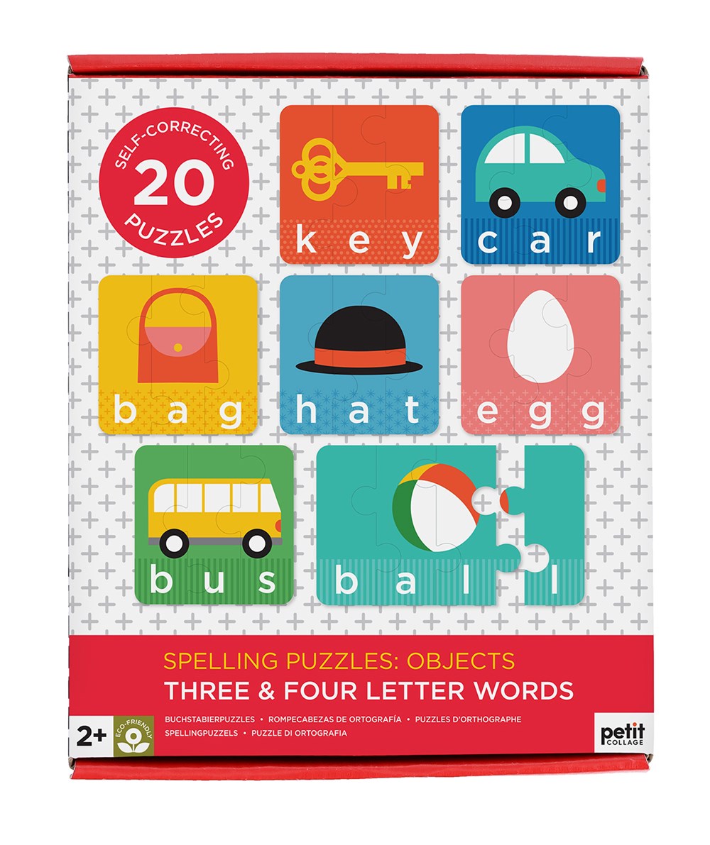 Piece together the three- and four-letter words and make spelling fun with these self-correcting jigsaw puzzles. Designed using bright colors and bold, easy-to-read lowercase letters, this set includes 20 puzzles featuring everyday objects a child is likely to encounter, such as a bag, hat, egg, bike, shoe, and leaf.For ages 2+, Spelling Puzzles: Objects helps develop a child’s fine motor skills, hand-eye coordination, and improve their letter and shape recognition. Plus, the self-correcting nature of the jigsaws makes learning new words a positive experience.Made from 70% FSC-certified paper and printed with vegetable inks.