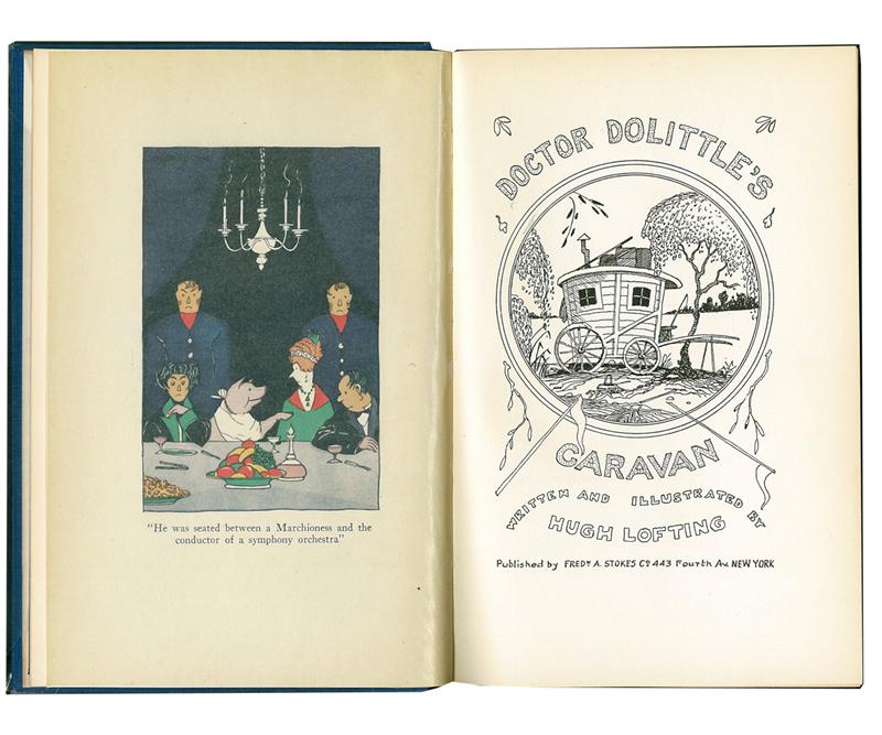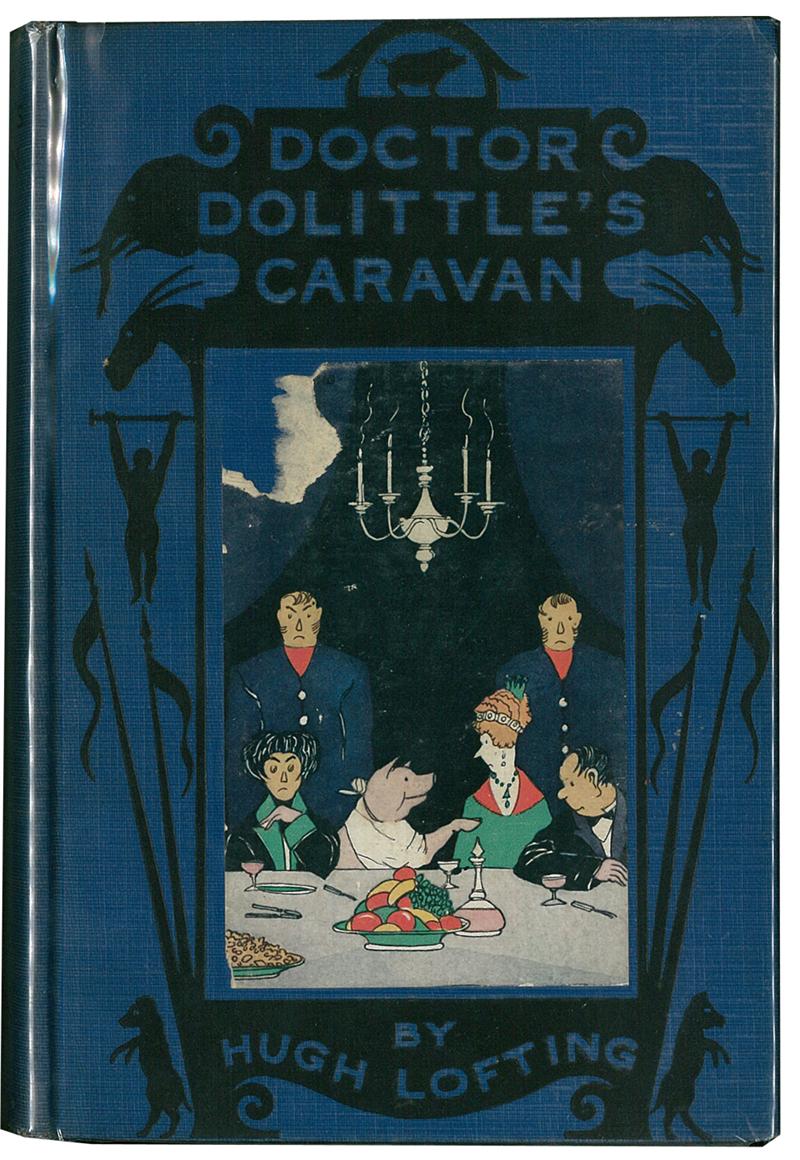 LOFTING, Hugh. Doctor Dolittle's Caravan. Written and Illustrated by Hugh Lofting. NY: Fred. A. Stokes Co. [1926]. 12mo, xii 342pp. Blue cloth pictorially stamped in black and with color pictorial label. Spine ends and corners worn, label rubbed at edges, spine a bit sunned, rear hinge mended, two tiny nicks at fore-edge of frontispiece, else a clean, tight copy.