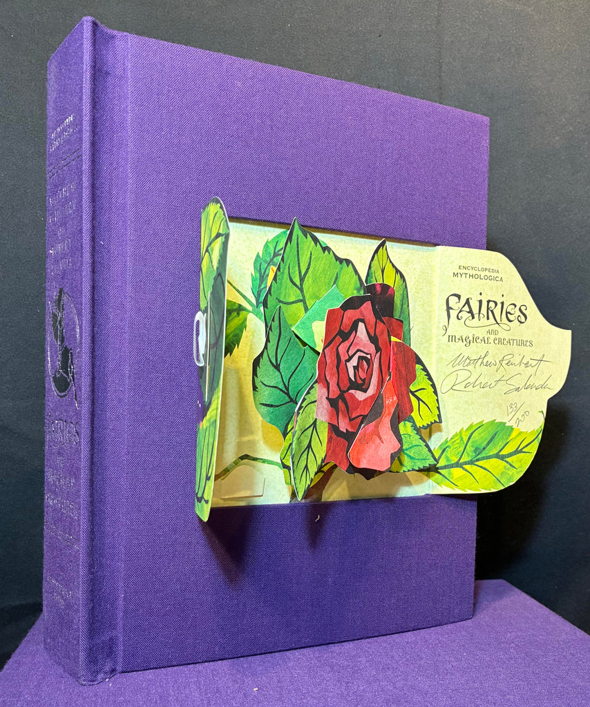 SABUDA, Robert and REINHART, Matthew. Enyclopedia Mythologica: Fairies and Magical Creatures. By Matthew Reinhart and Robert Sabuda. [Cambridge, MA: Candlewick Press, 2008]. 8vo, [10]pp. Purple cloth stamped in silver on spine with color pop-up affixed to the front cover, housed in a purple slipcase. Color pop-up illustrations on every page. A fine copy in original purple cloth slipcase with satin ribbon pull, housed in publishers original cardboard shipping box. Signed by the authors, Robert Sabuda and Matthew Reinhart.