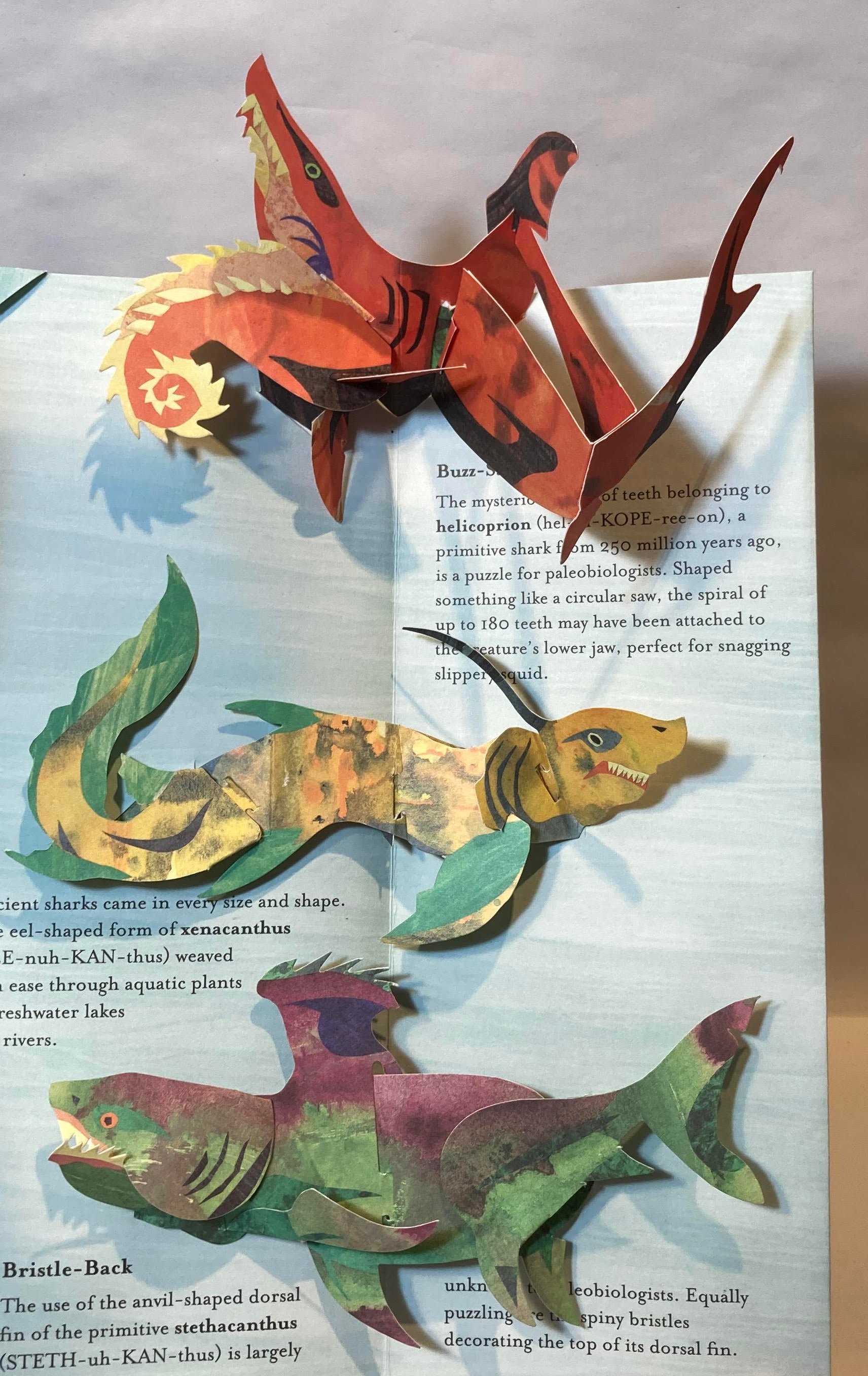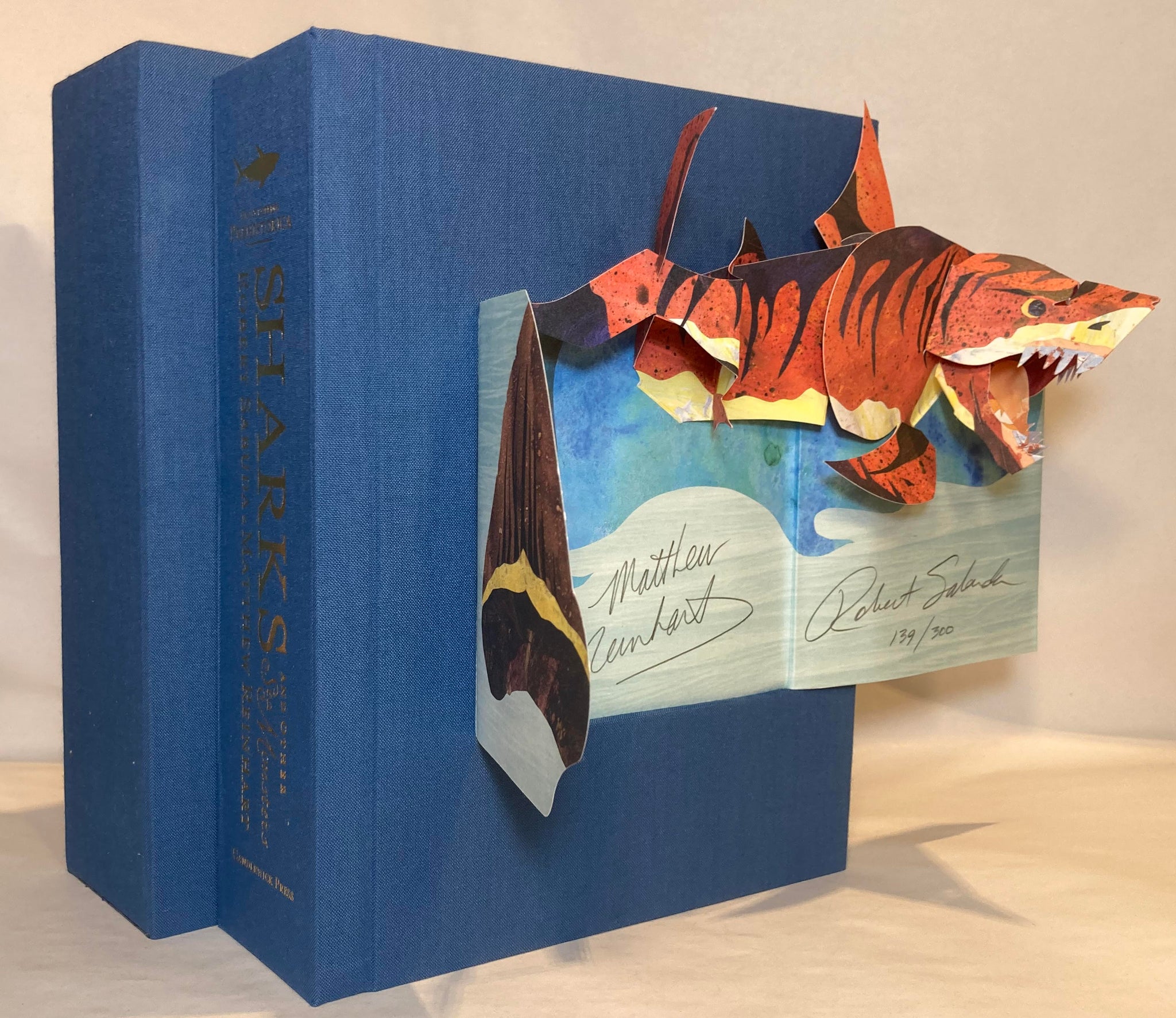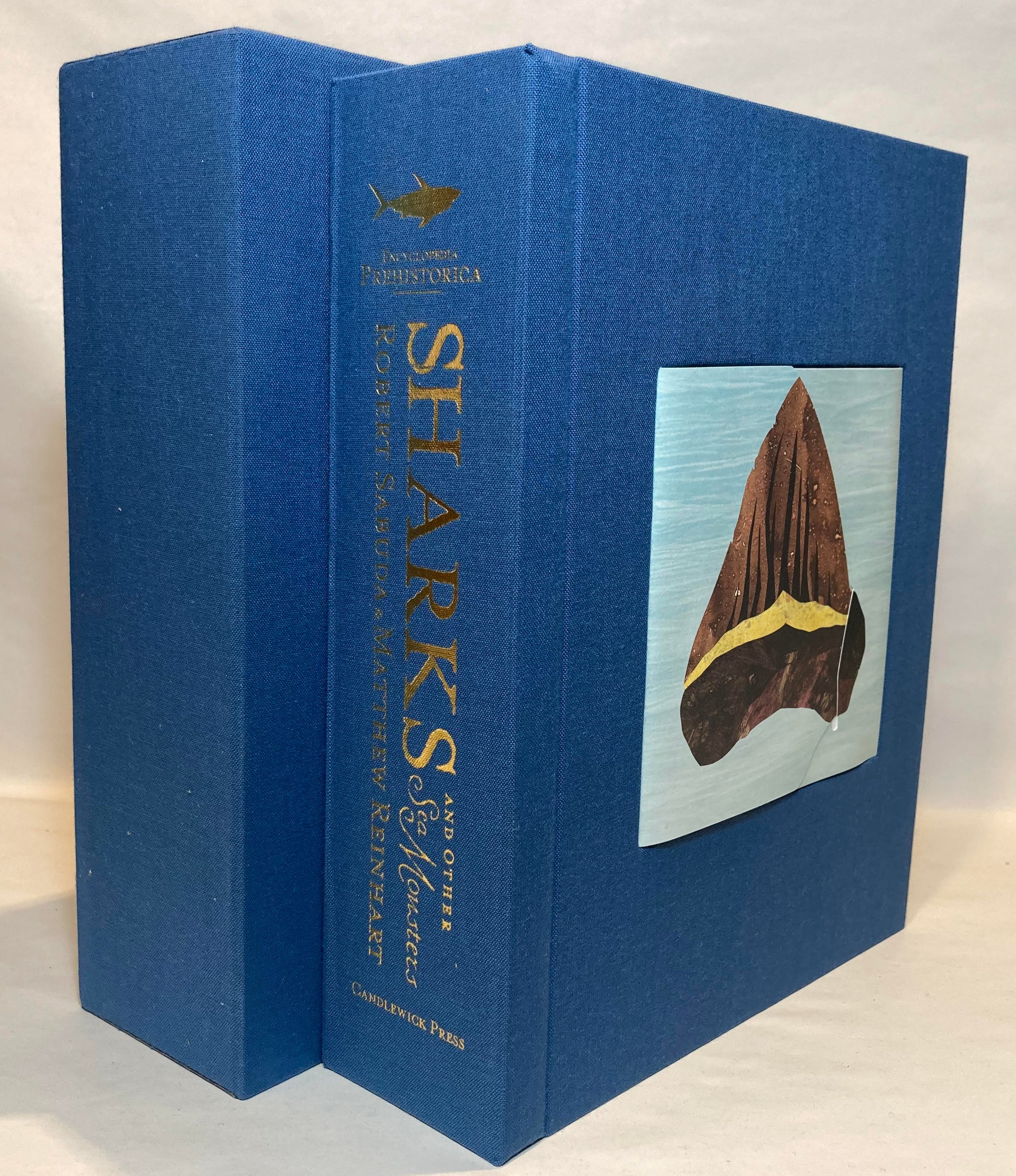 SABUDA, Robert and REINHART, Matthew. Encyclopedia Prehistorica: Sharks and Other Sea Monsters. By Matthew Reinhart and Robert Sabuda. [Cambridge, MA: Candlewick Press, 2006]. 8vo, [10]pp. Light blue cloth with spine stamped in gilt and color pictorial pop-up affixed to the front cover, housed in a light blue slipcase with satin ribbon pull. Color pop-up illustrations on every page. Spine a tad sunned, else a fine copy in original light blue cloth slipcase, housed in publishers original cardboard shipping box. Signed by the authors, Robert Sabuda and Matthew Reinhart.