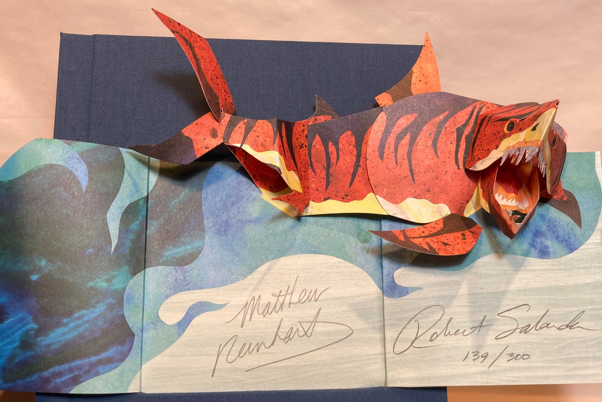 First edition thus, limited issue, being one of 300 numbered copies, signed by Robert Sabuda and Matthew Reinhart, and featuring an extra pop-up affixed to the books cover. While dinosaurs patrolled the lands, massive prehistoric sharks, giant scorpions, and colossal squid cruised the ancient oceans most with just one thing in mind: eat or be eaten. In this companion volume to the best-selling Encyclopedia Prehistorica: Dinosaurs, pop-up masters Robert Sabuda and Matthew Reinhart explore the prehistoric underwater world, where monsters like megalodon ruled the waves. Full of captivating facts and more than 35 breathtaking pop-ups, this incredible volume is sure to astonish and amaze everyone from budding marine biologists to confirmed landlubbers.