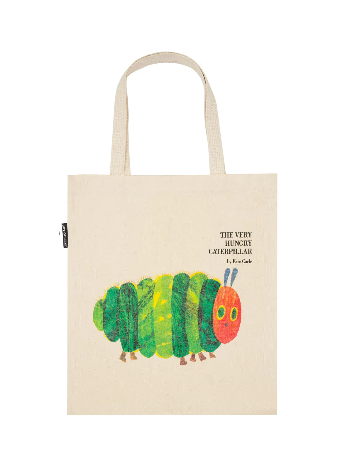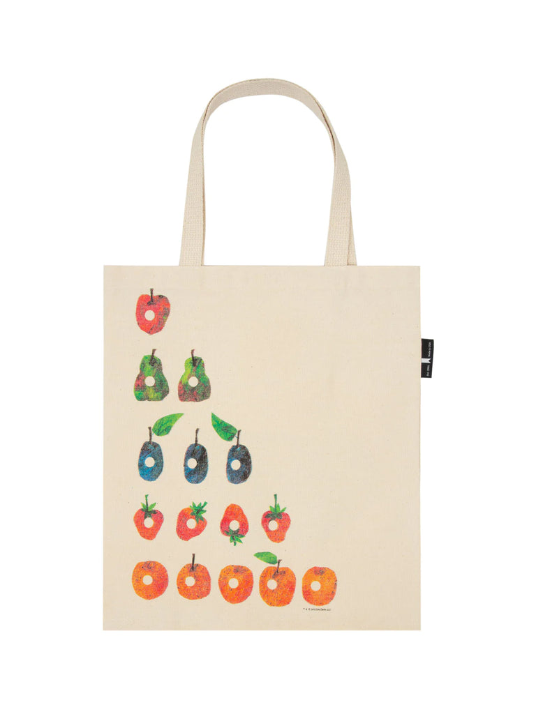 Double-sided tote bag featuring artwork from the first edition cover for The Very Hungry Caterpillar by Eric Carle.