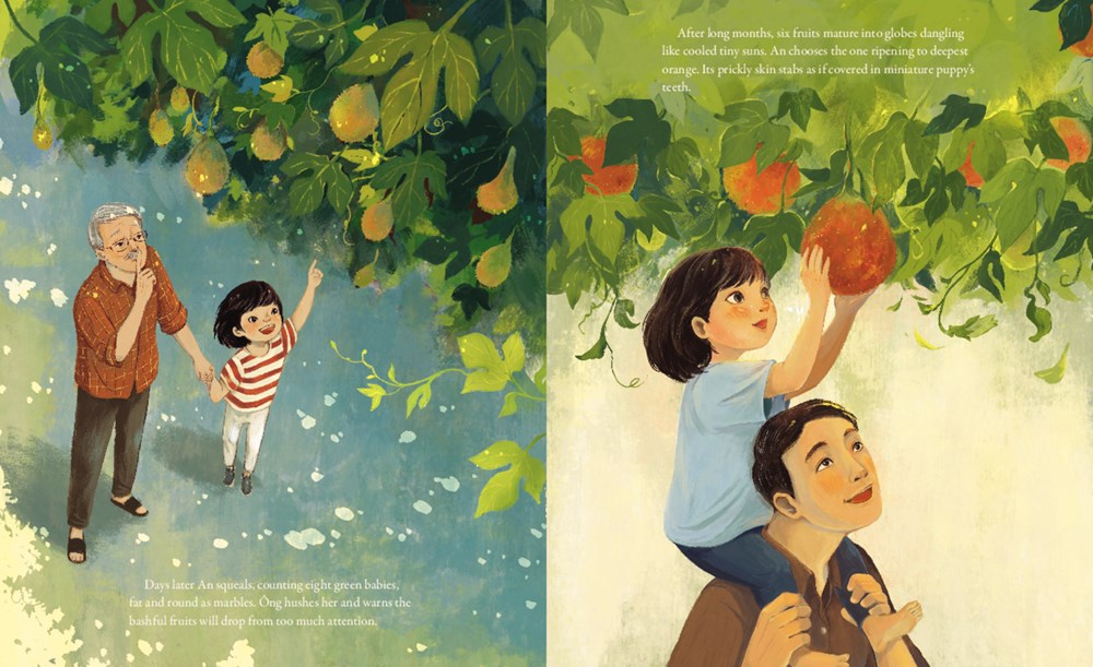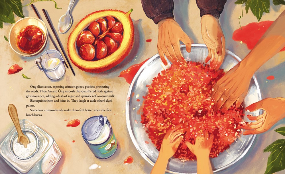 An’s grandmother Bà sometimes gets trapped in her cloudy memories. An and her grandfather, Ông, come up with a plan to bring her back to a happy moment: They grow gấc fruits so they can make xôi gấc, Bà’s favorite dish from her wedding in Vietnam many years ago.