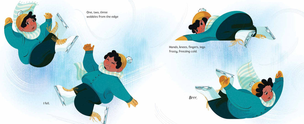 A young Black child passes an ice rink every day walking home with Momma. Last year, the rink was tricky. It looked clear and smooth, but felt rough and rude after a fall. Brrr! Ouch! Even so, the child hasn’t been able to stop thinking about that rink. The young skater is determined to do something for the first time: a spin on the ice. Because, as Momma says, nothing is impossible.