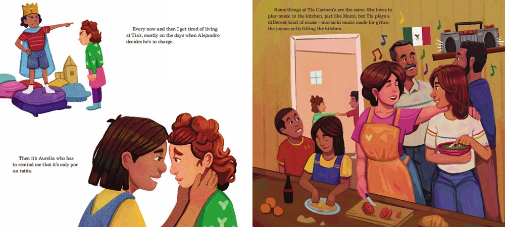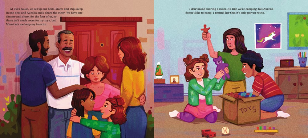 It’s not always easy sharing a room or being in a house full of loud cousins, but Papi reminds the girls that it’s only por un ratito—just for a little while. In the meantime, there is always someone to play with, the mealtimes are filled with music and laughter, bedtime is for snuggling in tight. Maribel realizes that maybe being there por un ratito isn’t so bad after all.