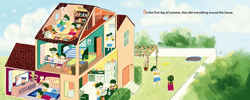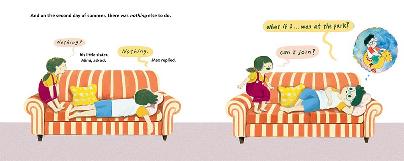 It’s only the second day of summer, and Max is completely out of things to do. As he cycles through a series of fantastical ideas, Max can’t stop thinking how much more summer fun he could have–only if he were somewhere else!