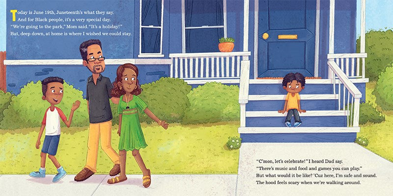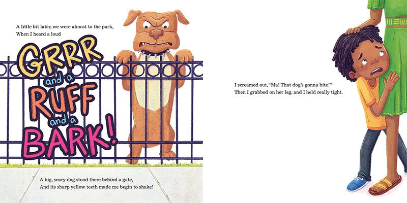 But sometimes the hood feels scary when we’re walking around. I wish I could stay home where it’s safe and sound. Where the dogs aren’t BARKING, and the cars aren’t HONKING, and the streetlights aren’t FLICKERING.