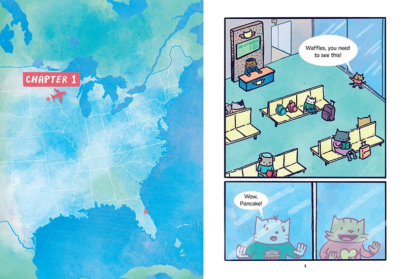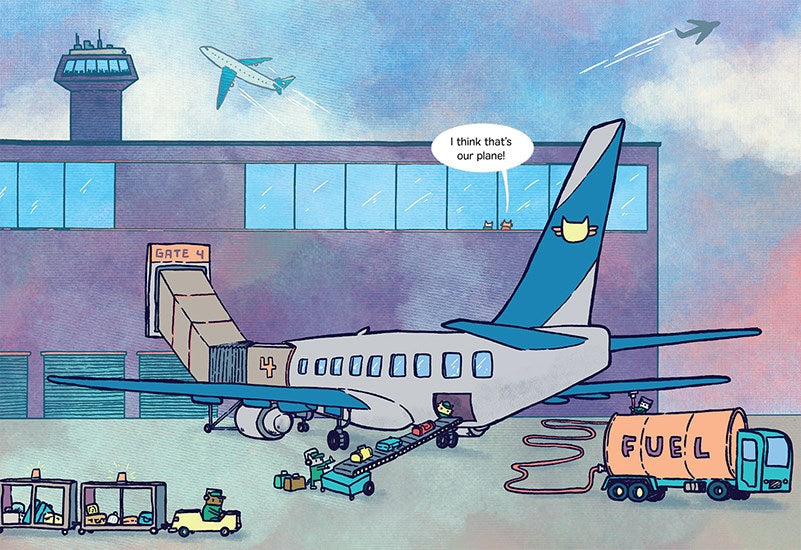 It’s time to visit Gramps and Grammers and that means Waffles, Pancake, and Mom-Cat are taking a very early flight to get to maximize the fun-times! This is the kittens’ first airplane ride and while Pancake is excited to get on board, Waffles is a little more nervous: an airplane has wings, but airplane wings don’t flap! How does it stay up in the air?