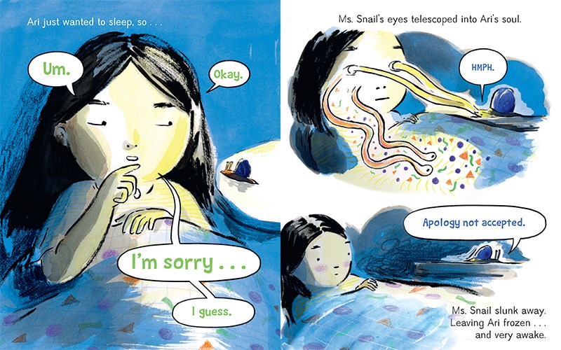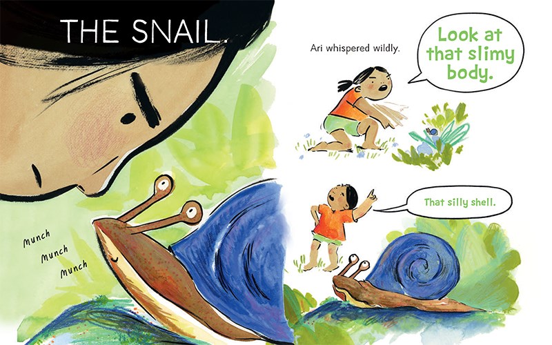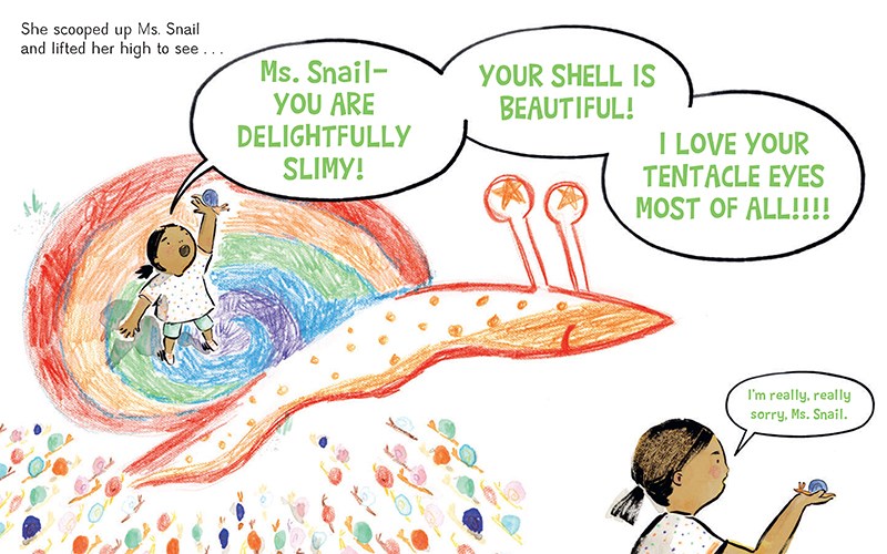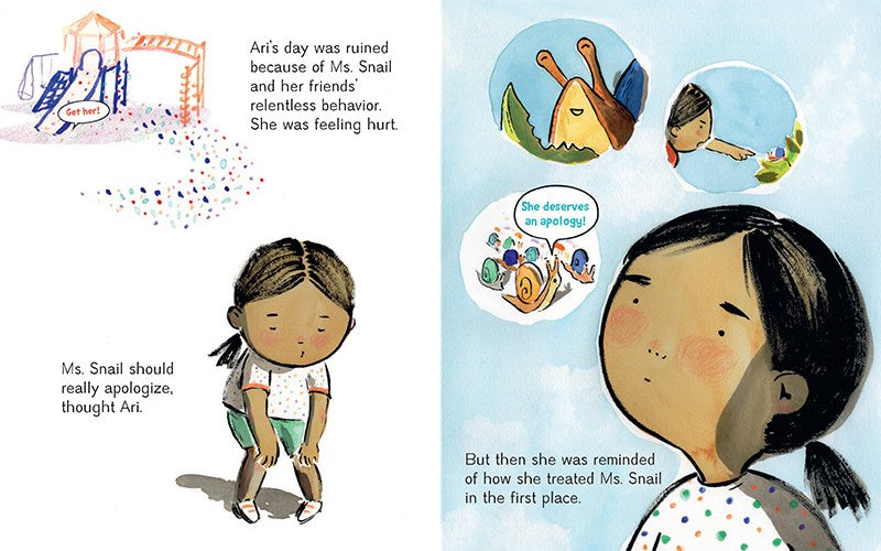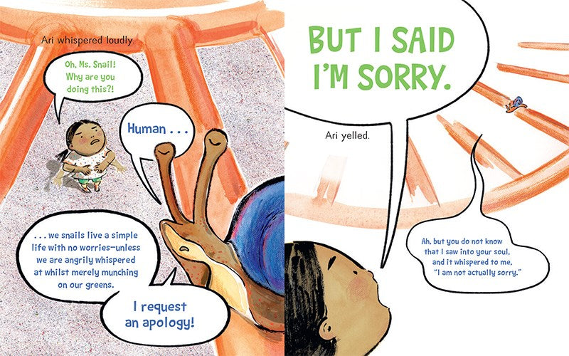 Ari is feeling angry. When she takes that anger out on an innocent snail, the snail demands an apology! Which Ari gives, half-heartedly. And that's that. Until Ms. Snail and her friends appear in every corner of Ari’s life, determined to elicit the most genuine apology from an increasingly regretful girl.