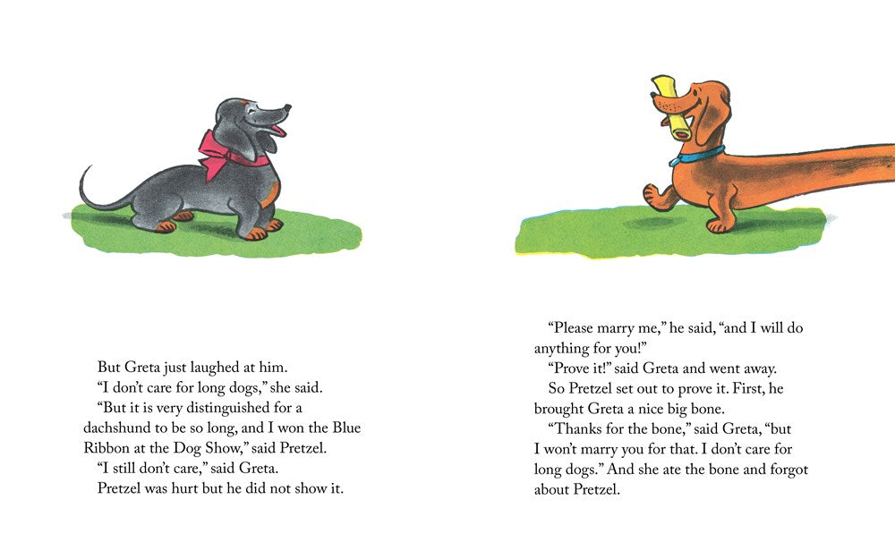 One morning in May five little dachshunds are born. But one grows up to be the longest of all! Pretzel easily wins a blue ribbon at the dog show and the admiration of everyone—everyone except Greta, the little dachshund across the street, who doesn't care for long dogs. But Pretzel is able to use his unique gift to win Greta over, and before long they have puppies of their very own. This story that begins and ends with puppies is perfect for dog lovers, fans of Margret and H. A. Rey’s picture books, and anyone who is a little bit different and special in their own way.