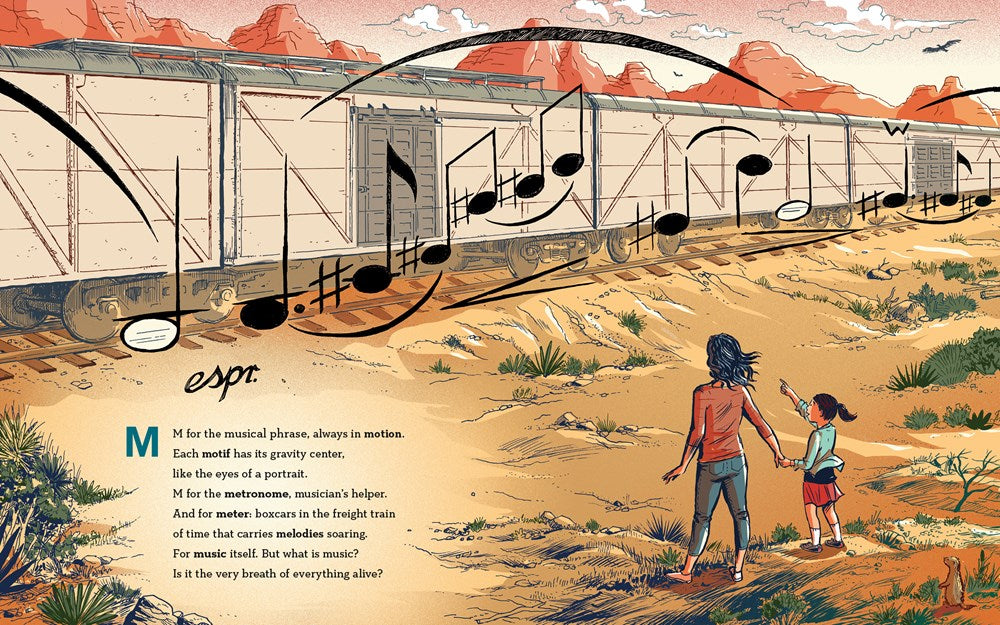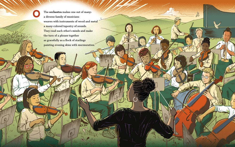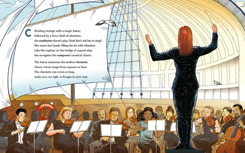 Two widely acclaimed poets—one a composer and classical pianist as well—have come together to create this extraordinary portrait of the orchestra in all of its richness and fascination, using the structure of the alphabet in a way that’s entirely new and delightful. A is for the first note you hear as you take your seat in the concert hall, played by the headstrong oboe. B is for the bassoon, “the orchestra’s jester, complaining impatiently through his nose.” And C is for the conductor, “like the captain on the bridge of a great ship, navigating the composer’s musical charts.”