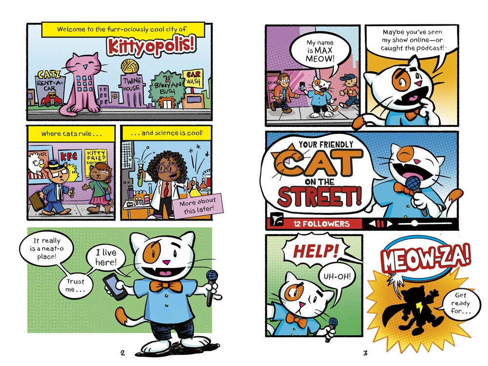 Max is just a regular cat in Kittyopolis, trying to make it big as a podcaster UNTIL he accidentally takes a bite of an RADIOACTIVE SPACE MEATBALL at his best friend Mindy's SECRET LAB. Then before you can say MEOWZA, Max becomes...The CAT CRUSADER! Being a super hero is fun--but not if you get so cocky, you forget your best friend! Will Max and Mindy make up? And together, can they save Kittyopolis from the evil Agent M and BIG BOSS?! Find out in this furr-ociously funny series! BONUS: Includes how to draw Max Meow!