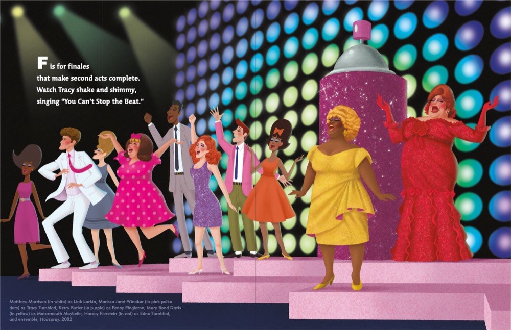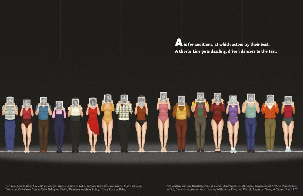 Step into the spotlight and celebrate a cavalcade of Broadway legends! Start with “A” for “audition” with the iconic line-up from A Chorus Line, then peek behind “B” to see the “backstage” buzz, and dance along with “C” for “choreographers”.