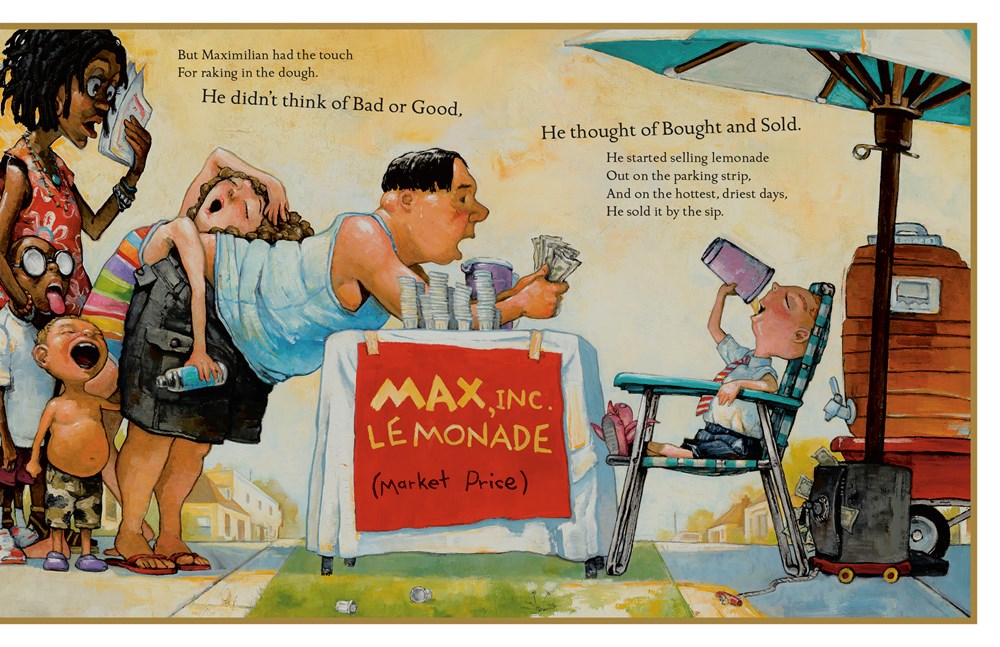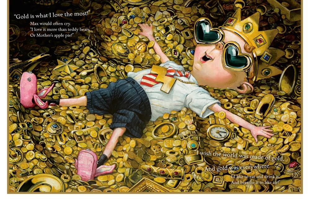 Max Midas isn’t like the other kids. Instead of trying to make friends, he decides to make millions and spends it all on what he loves best: GOLD. Gold statues. Gold fountains. Piles and piles of gold, and atop them all, a golden castle. But one day, things get lonely inside his shiny castle and Max finally learns that gold isn’t worth anything without friends and family by your side.