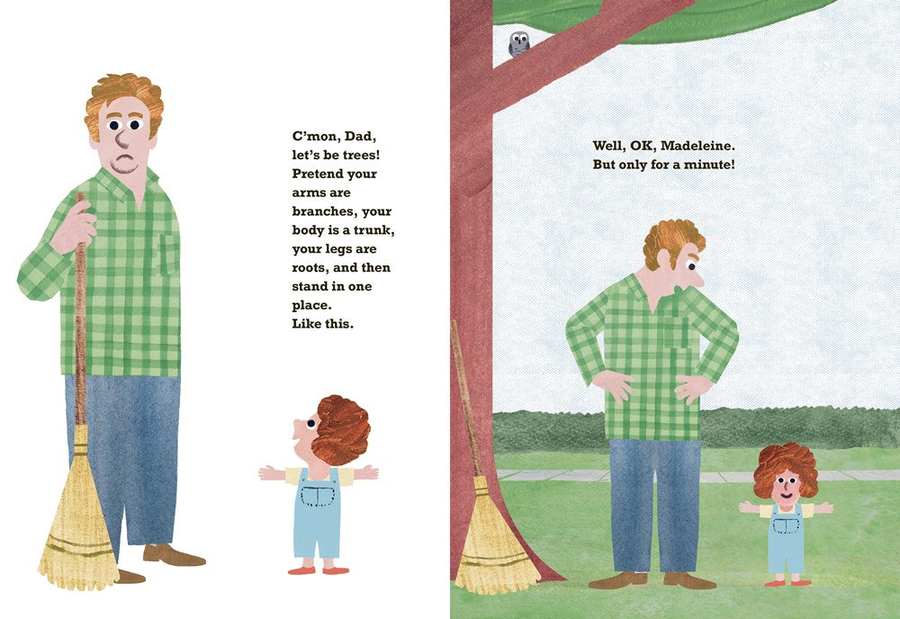 It’s easy to be a tree. Just pretend your arms are branches, your body is a trunk, and your legs are roots. Don’t move, even if a bird makes a nest on your head, a squirrel hides an acorn in your pocket, and a spider builds a web under your arm. It’s OK: Trees don’t mind those things. Or so says the little girl who persuades her father to be a tree all day long, no matter what, even in the rain!