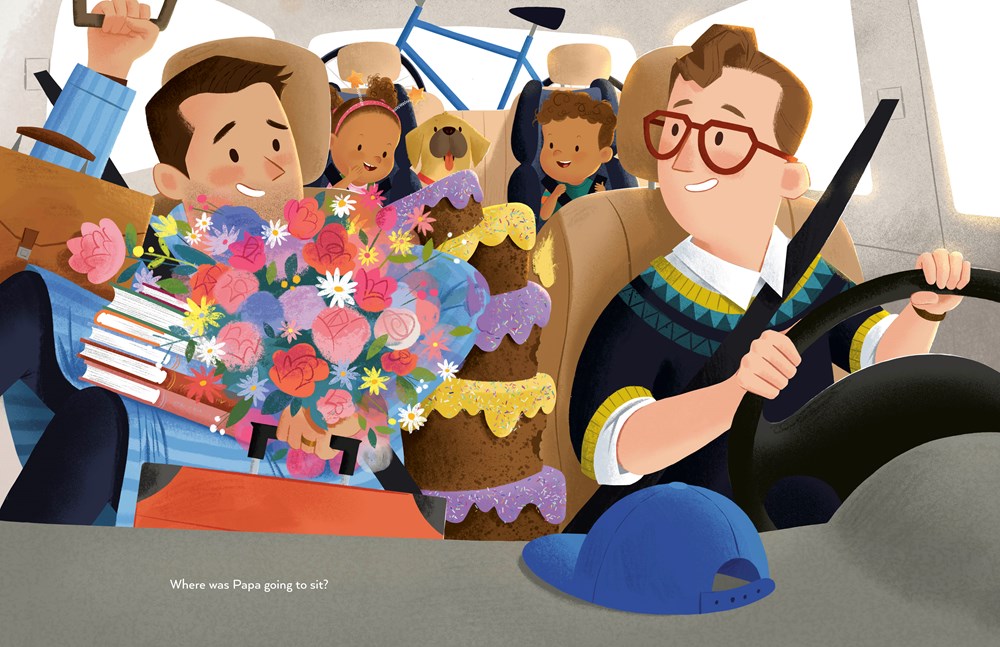 When Papa's plane arrives, they give him a huge hug—but when they bring him to the car, they realize there's one small problem: Where will Papa sit?