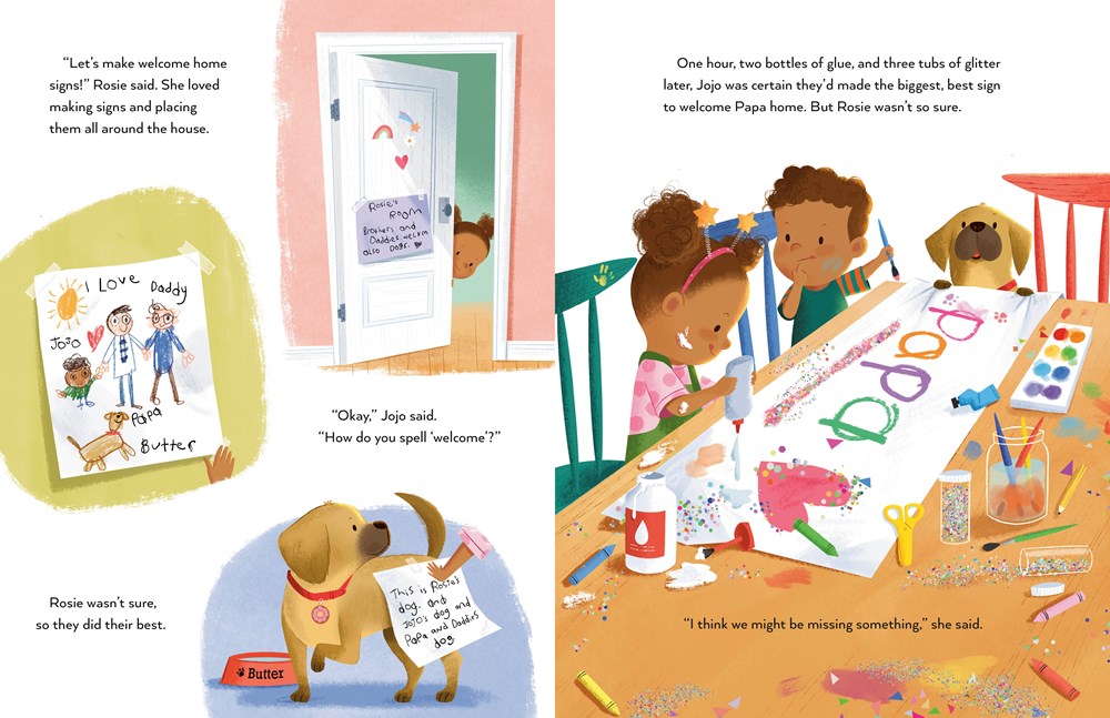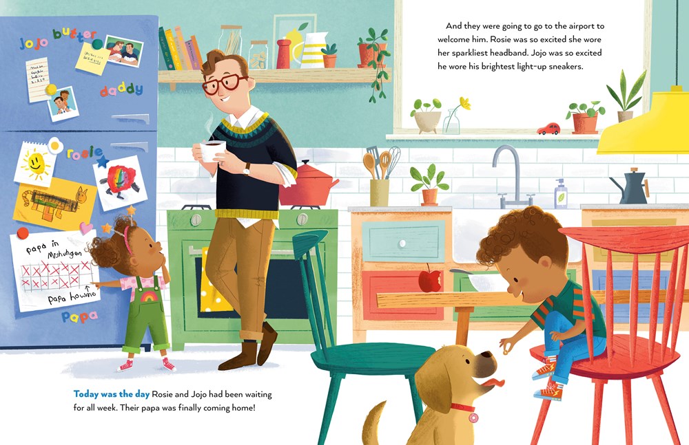 Jojo and Rosie's papa has been away on a trip, and they can't wait to welcome him home! They make signs, they pick flowers, and with Daddy's help, they bake a cake and pack the car with absolutely everything Papa might have missed while he was away.